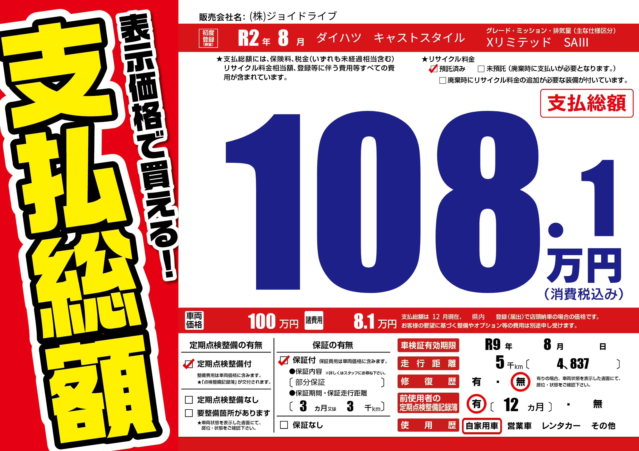 保証付き 保証内容(部分保証) 3ヶ月または(3)千kmまで |