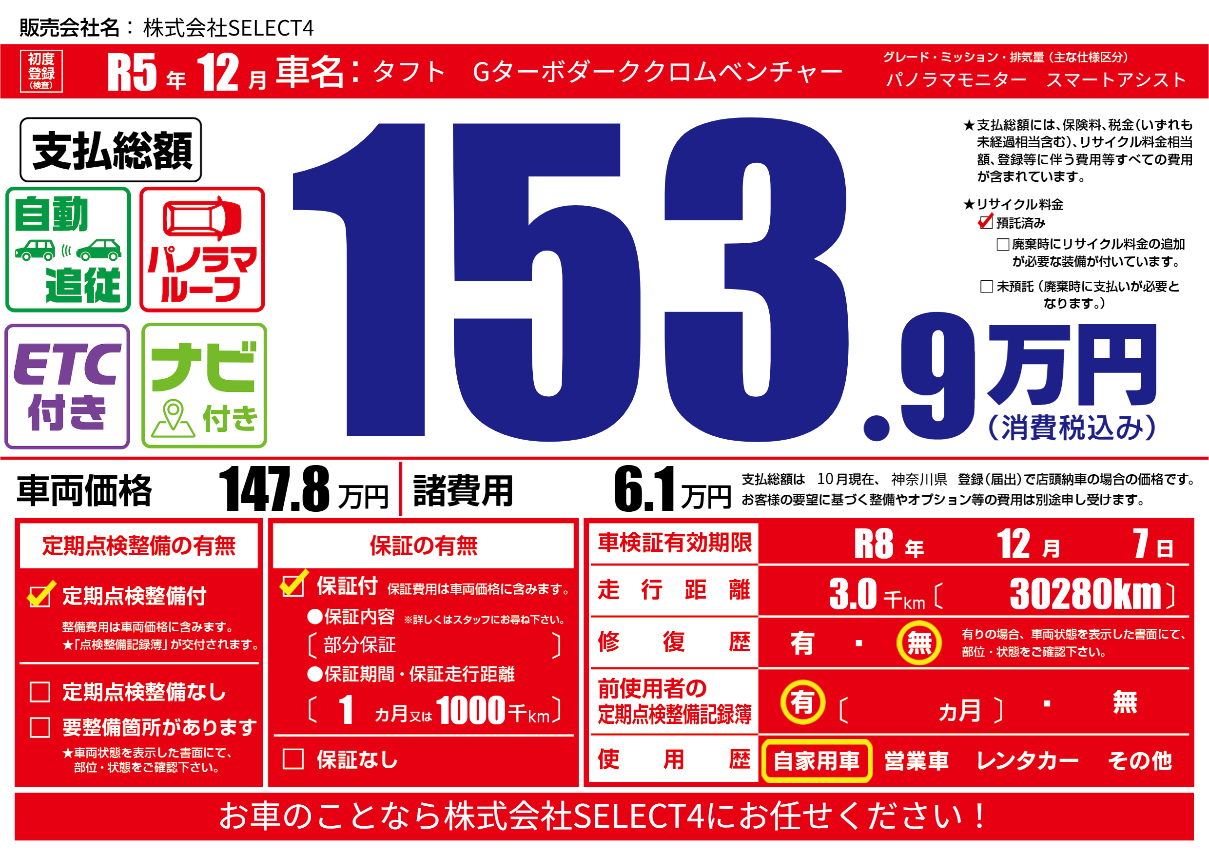 | 走行キロ | 0.3万km | 初年度登録 | R5年12月 |