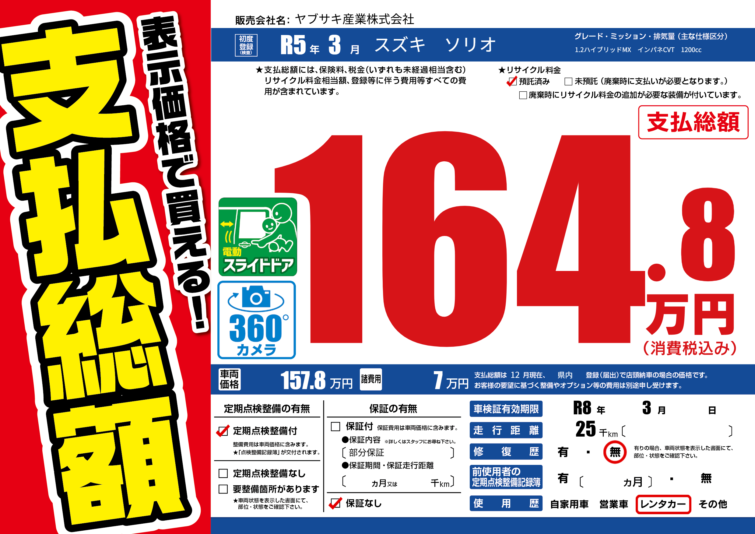 | 車名 | スズキ ソリオ | グレード ミッション 排気量 |