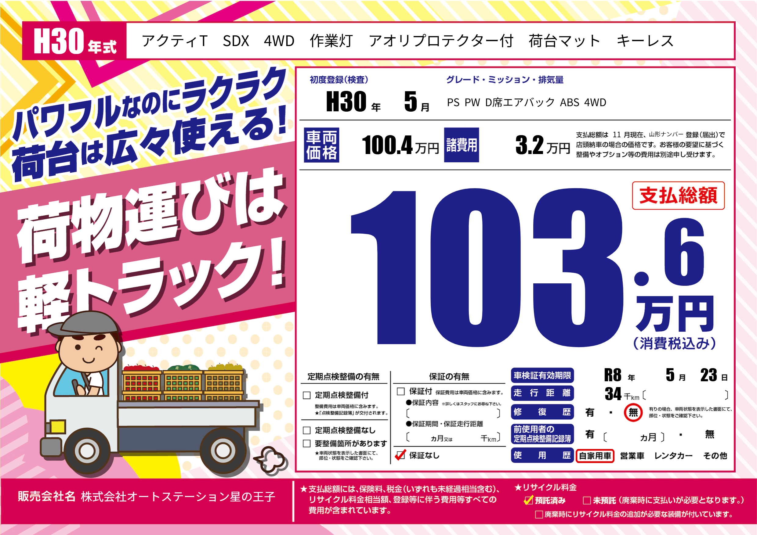 アクティT SDX 4WD 作業灯 アオリプロテクター付 荷台マット キーレス