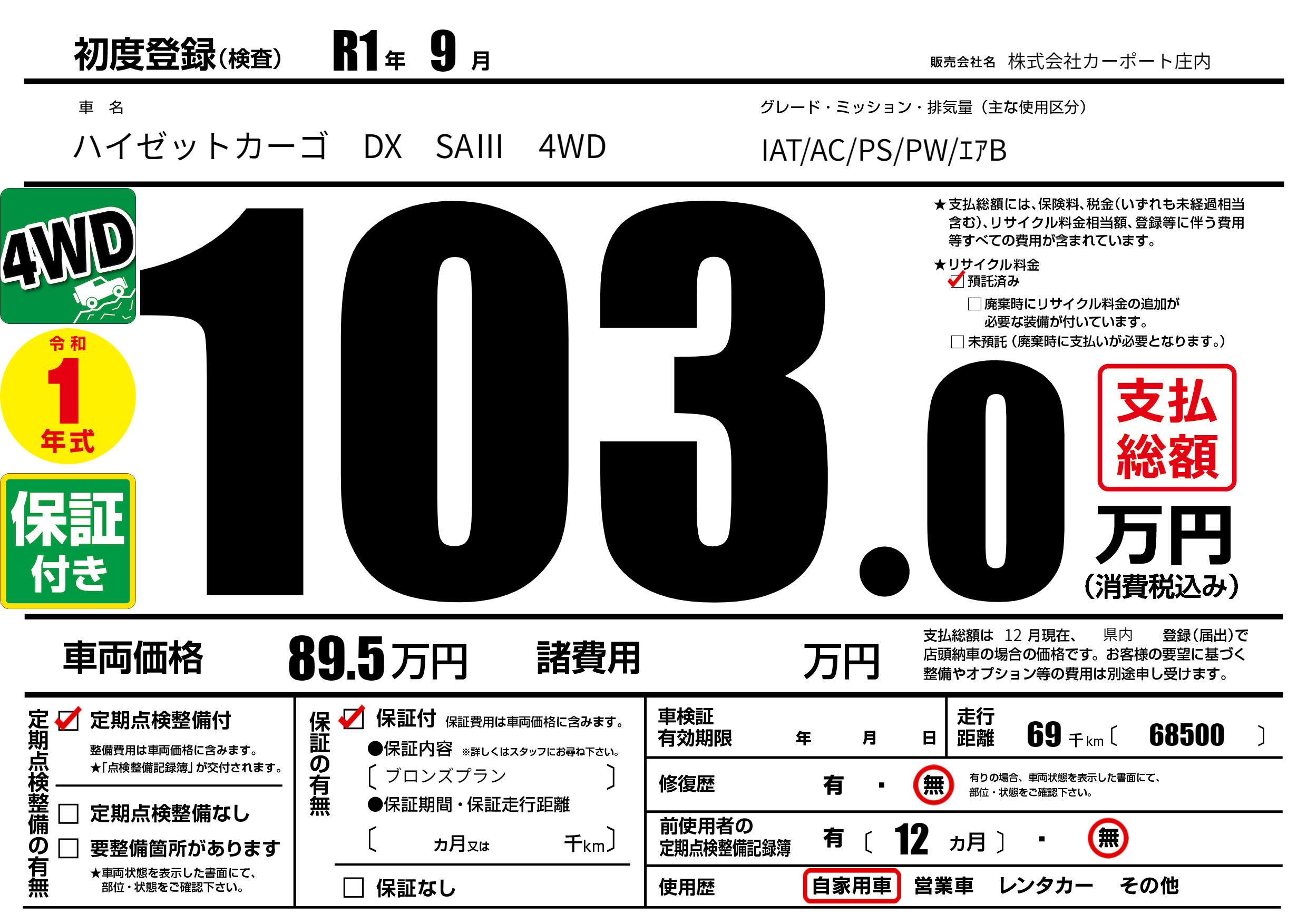 | 車名 | ハイゼットカーゴ DX SAⅢ 4WD | グレード ミッション 排気量 |