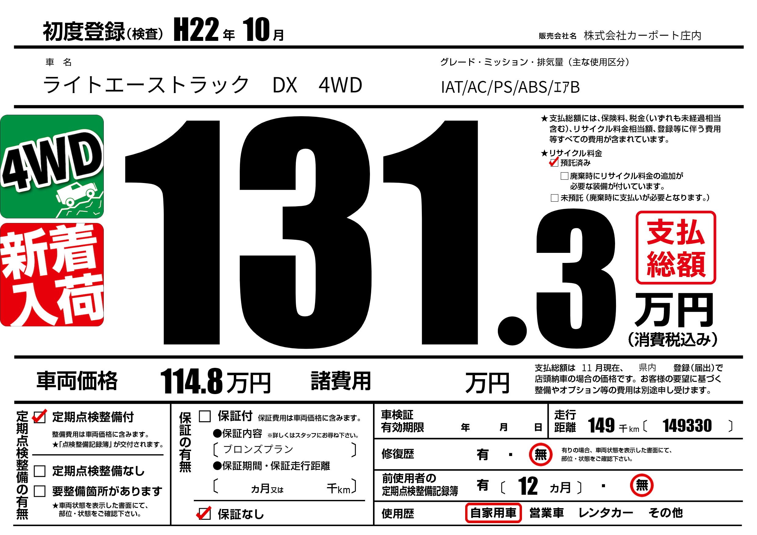 | 走行キロ | 14.9万km | 初年度登録 | H22年10月 |