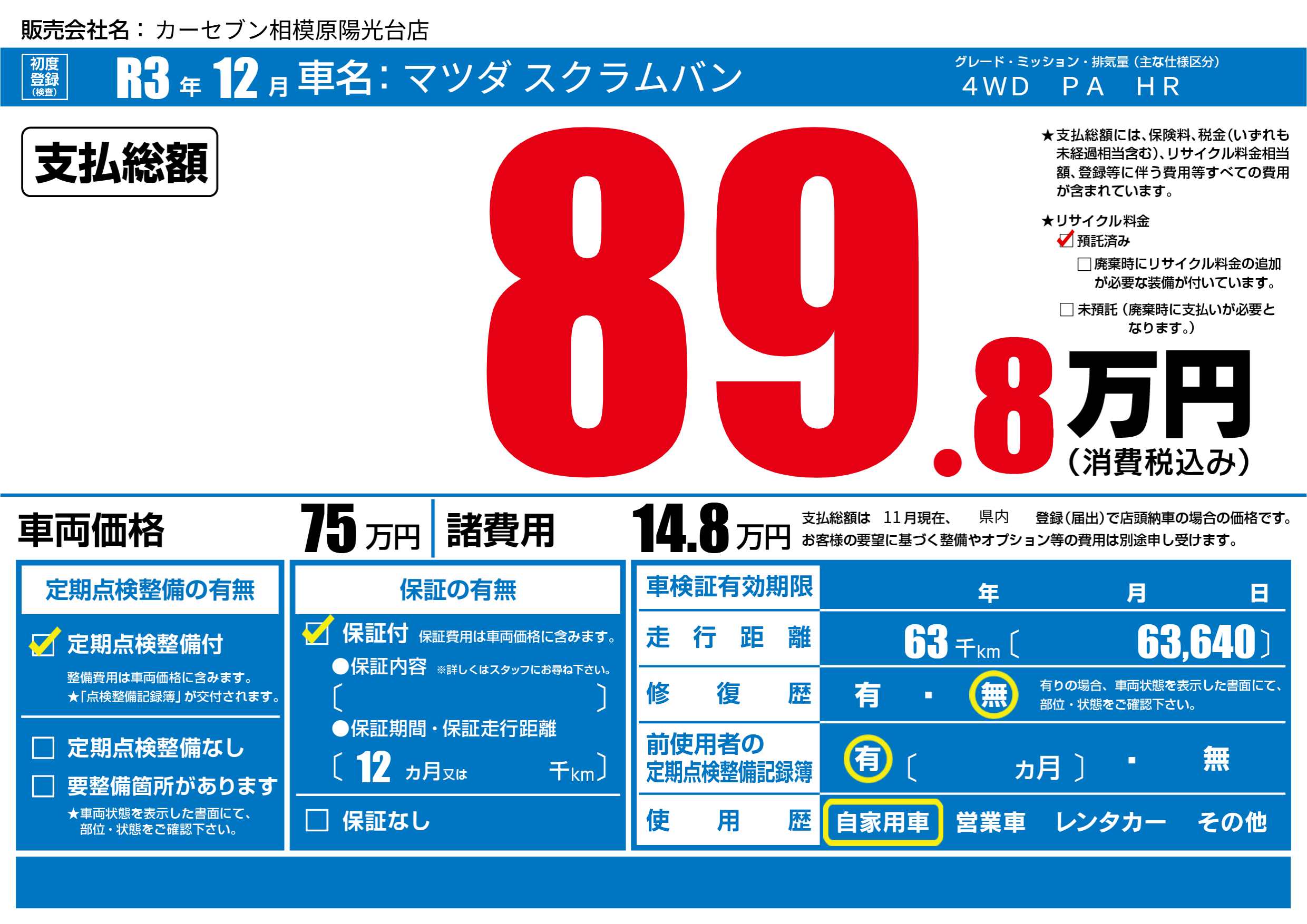 | 車名 | マツダ スクラムバン | グレード ミッション 排気量 |