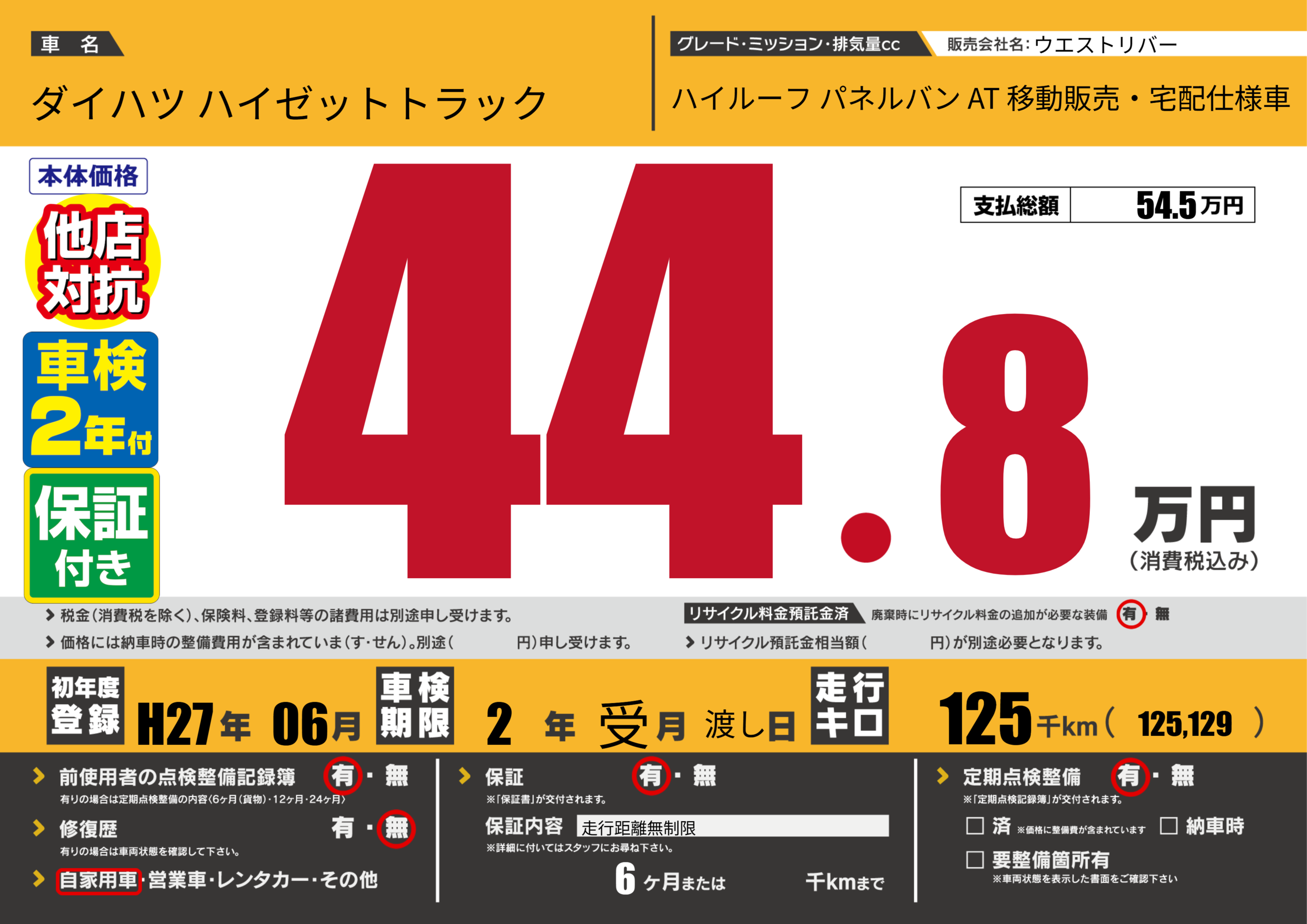 | 走行キロ | 12.5万km | 初年度登録 | H27年06月 |
