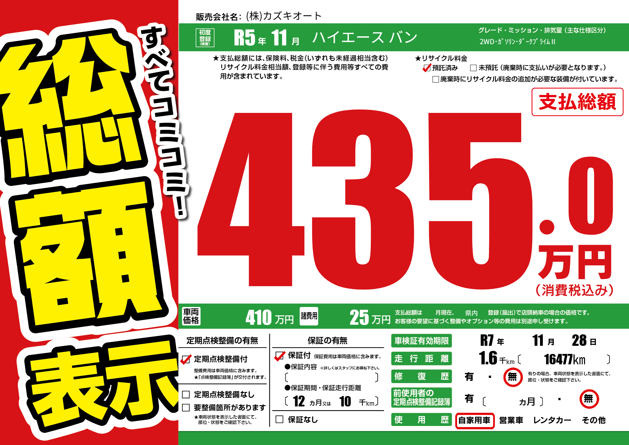 | 走行キロ | 0.1万km | 初年度登録 | R5年11月 |