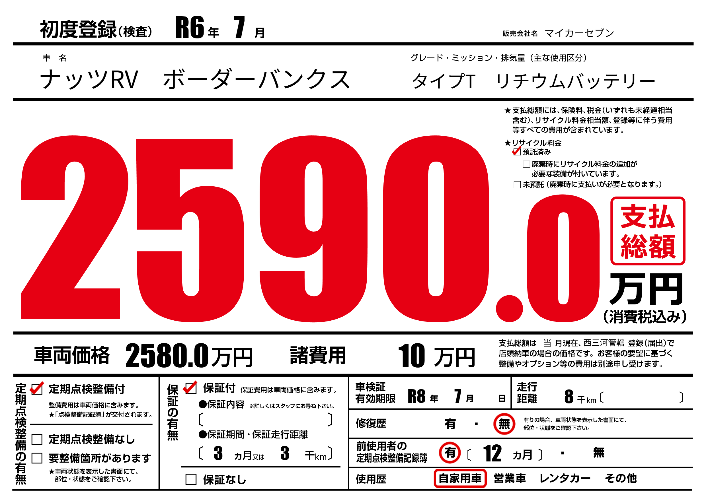 | 走行キロ | 0.8万km | 初年度登録 | R6年7月 |