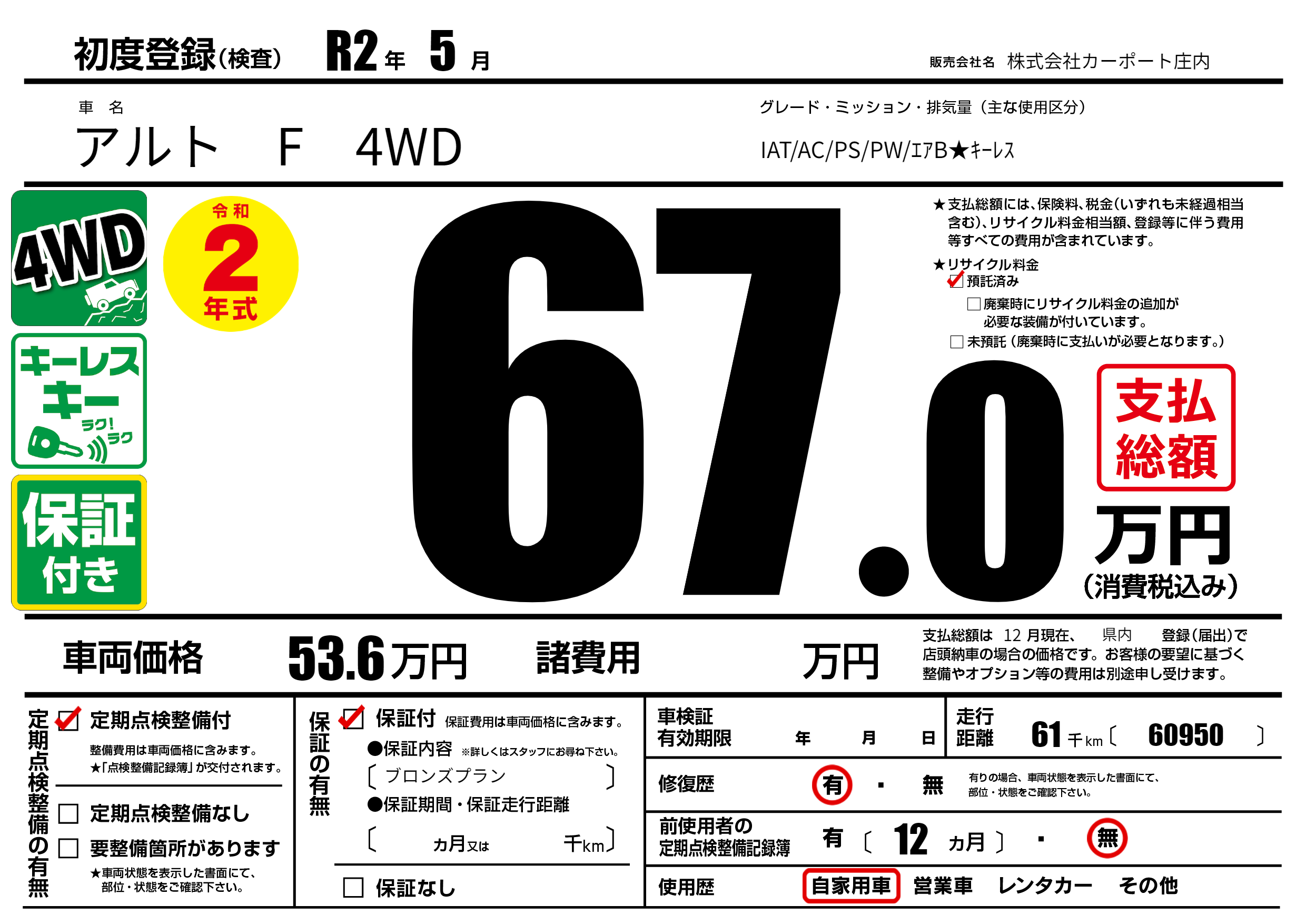 | 車名 | アルト F 4WD | グレード ミッション 排気量 |