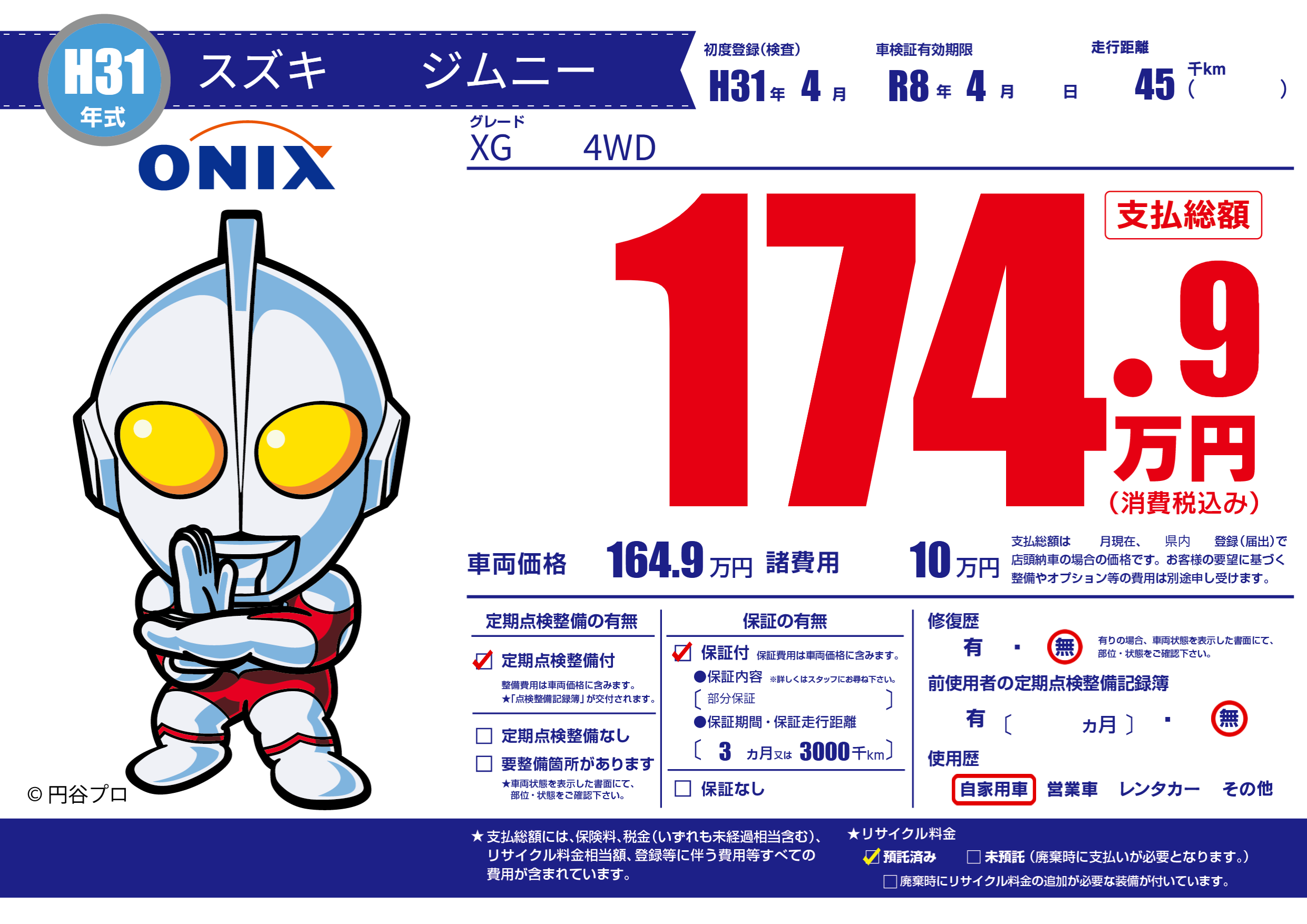 | 走行キロ | 4.5万km | 初年度登録 | H31年4月 |