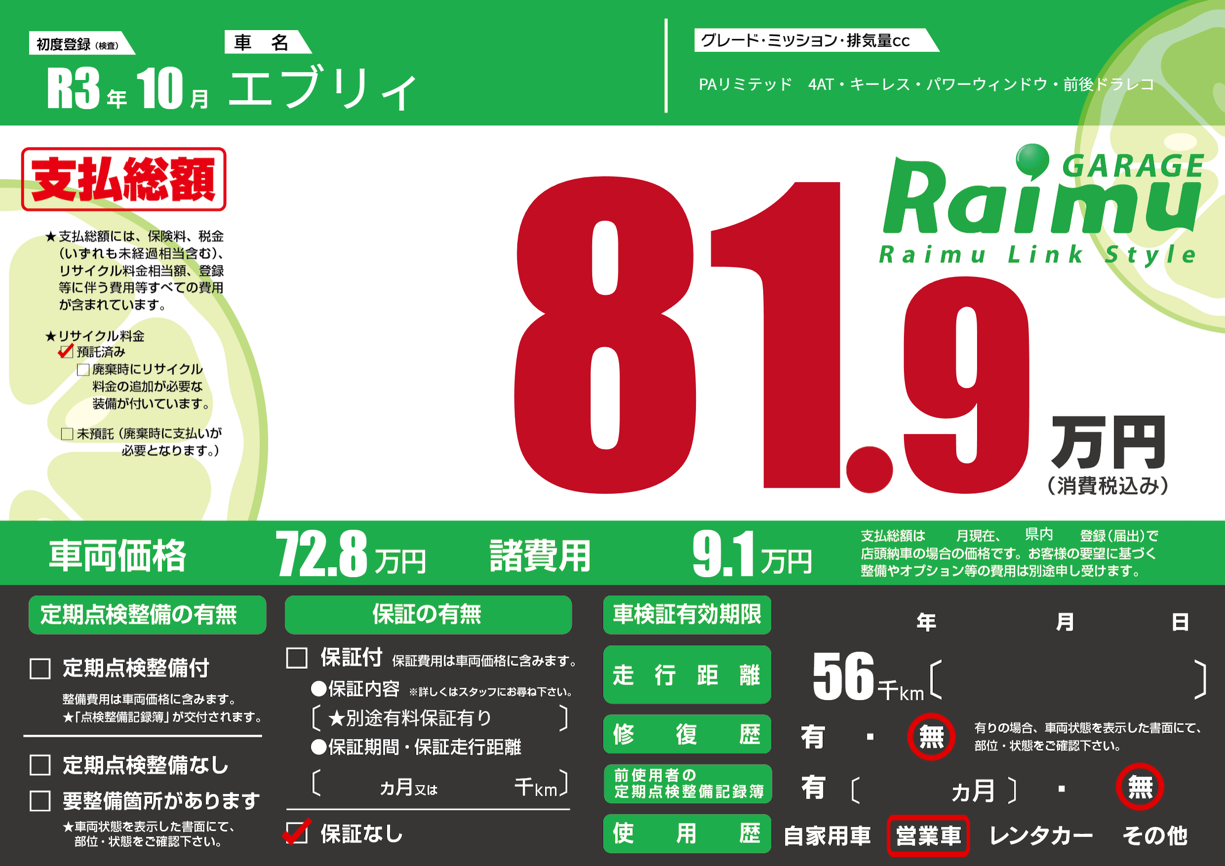 | 車名 | エブリィ | グレード ミッション 排気量 |