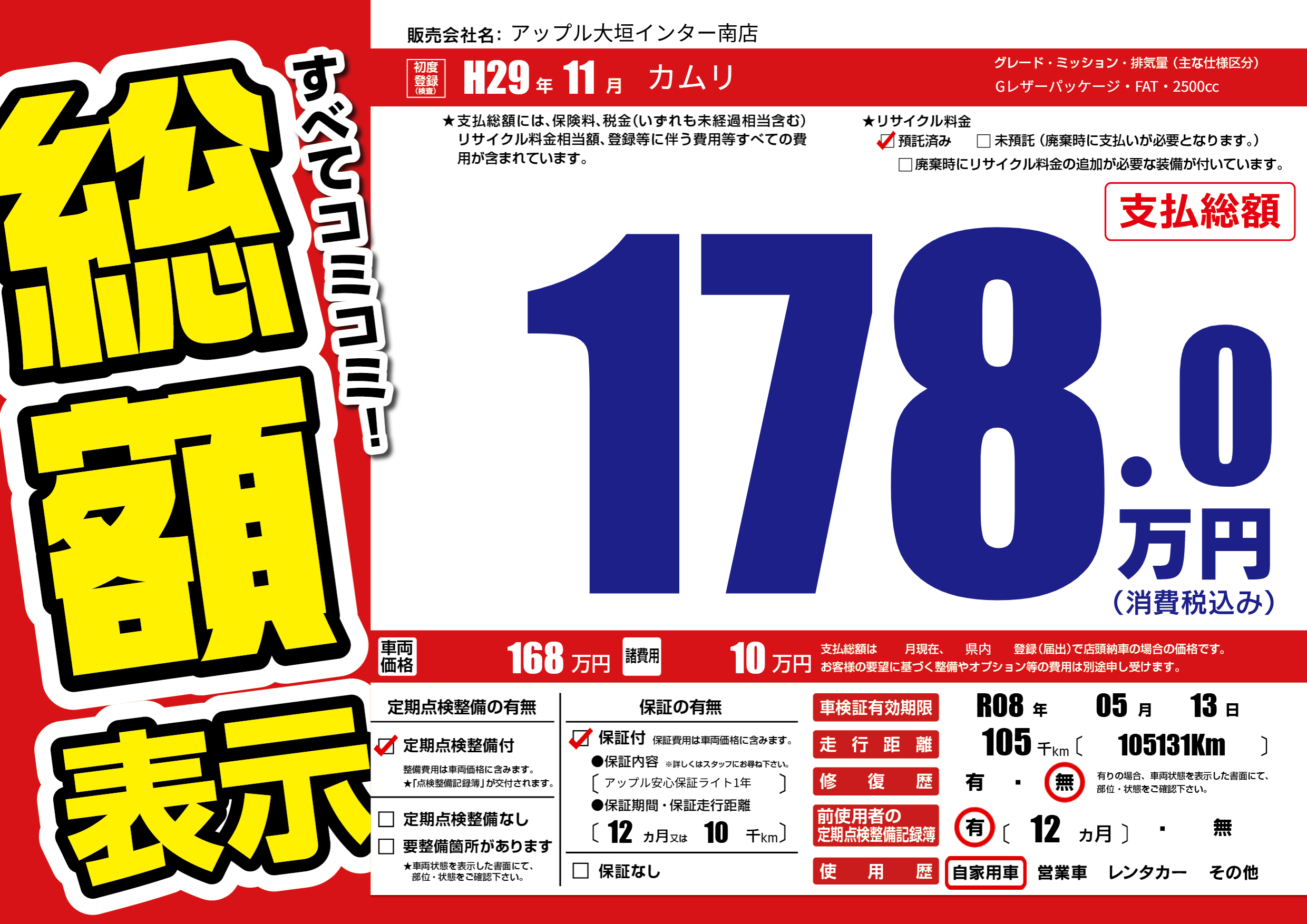 | 走行キロ | 10.5万km | 初年度登録 | H29年11月 |