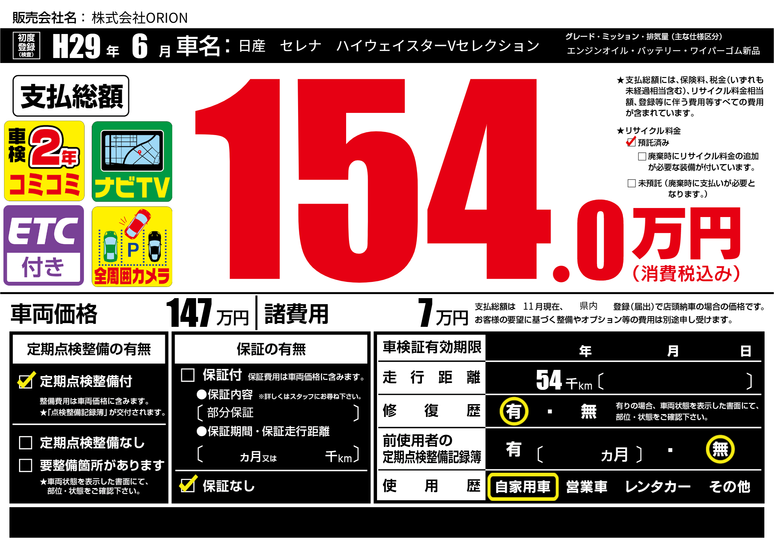 | 車名 | 日産 セレナ ハイウェイスターVセレクション | グレード ミッション 排気量 |