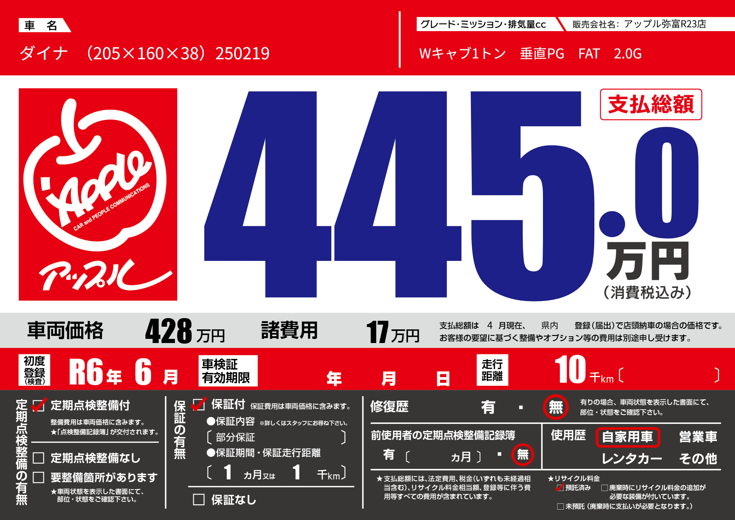 | 車名 | ダイナ (205×160×38)250219 | グレード ミッション 排気量 |
