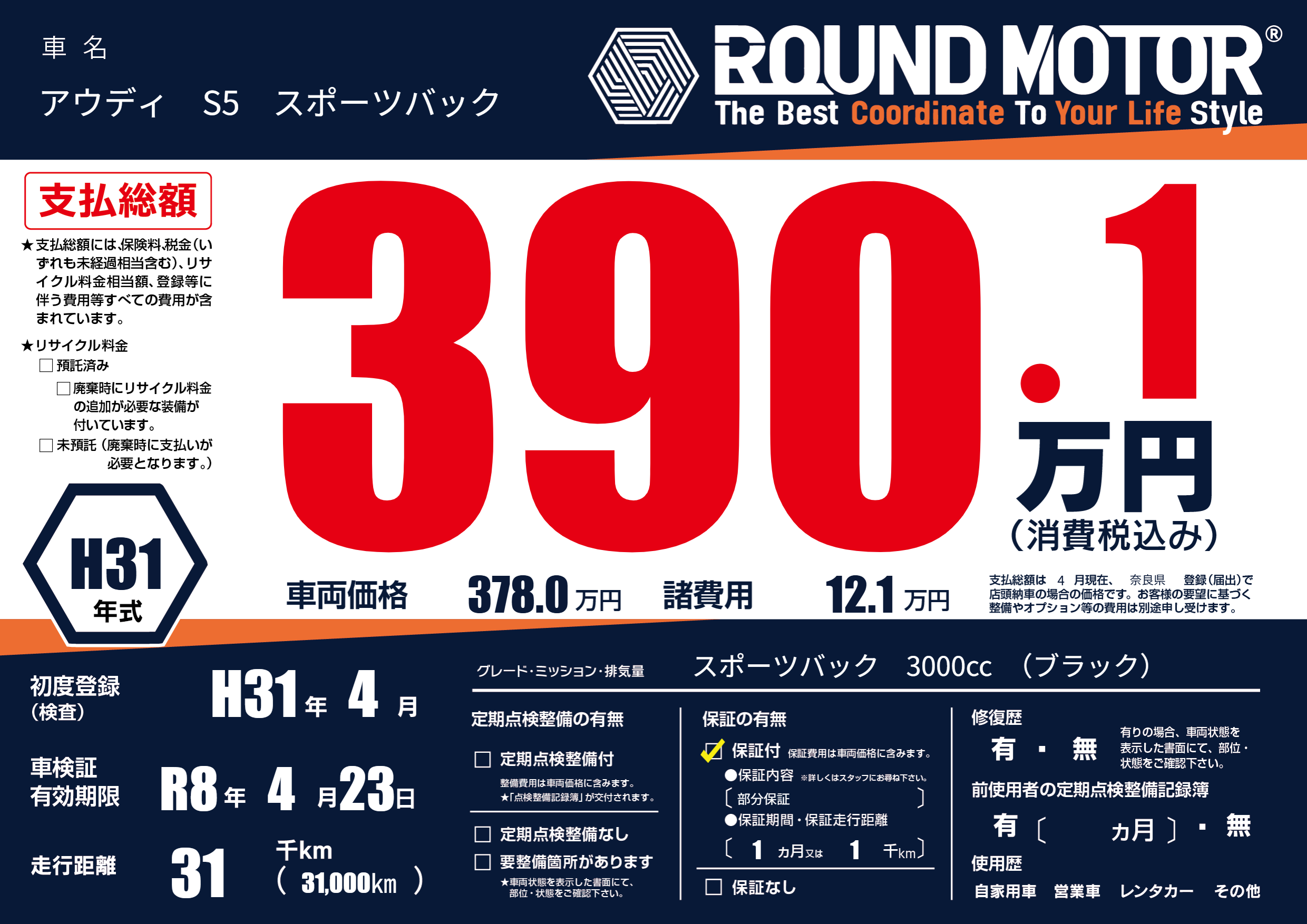 | 車名 | アウディ S5 スポーツバック | グレード ミッション 排気量 |