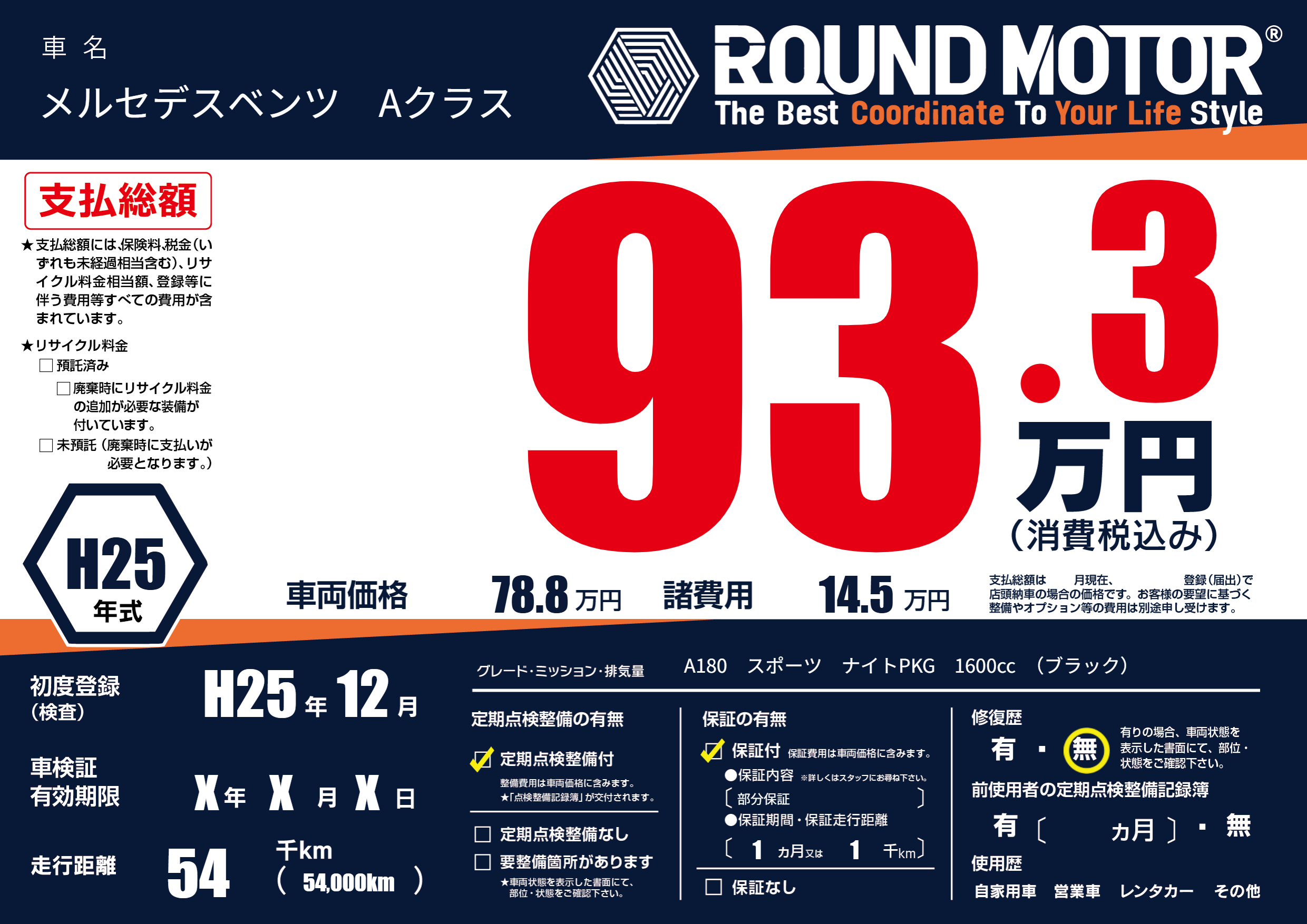 | 車名 | メルセデスベンツ Aクラス | グレード ミッション 排気量 |