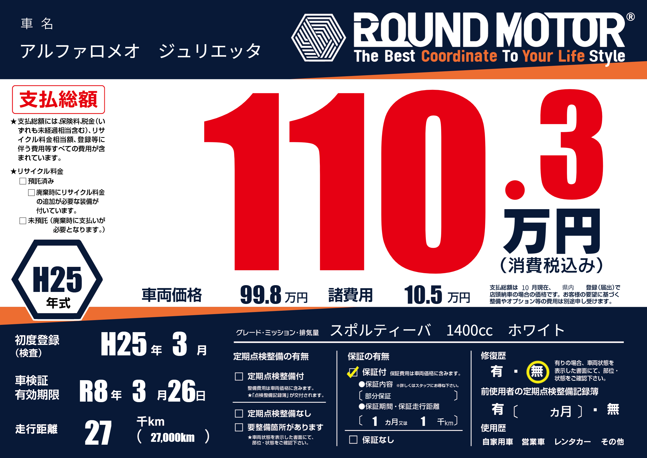 | 走行キロ | 2.7万km | 初年度登録 | H25年3月 |