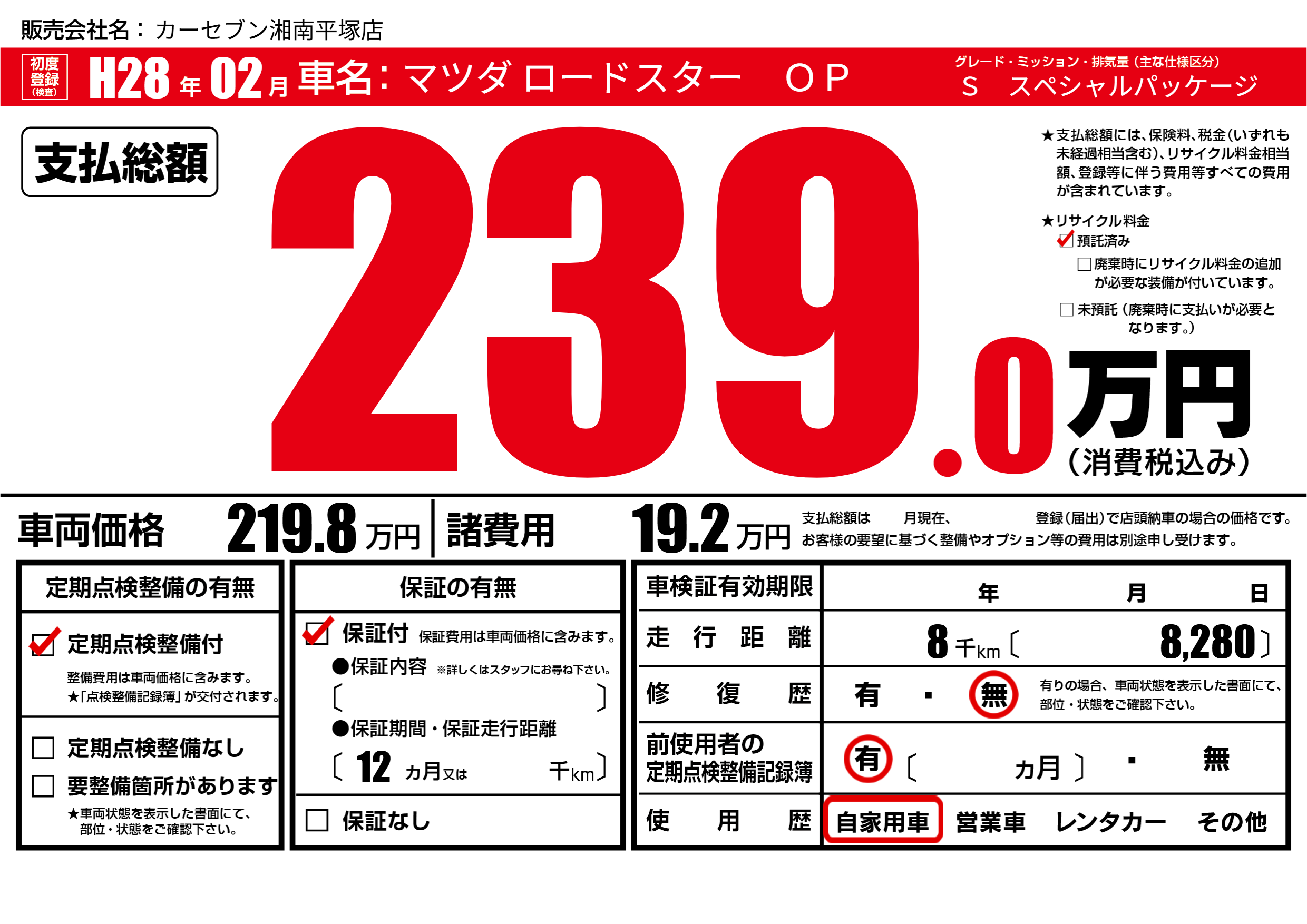 | 走行キロ | 0.8万km | 初年度登録 | H28年02月 |
