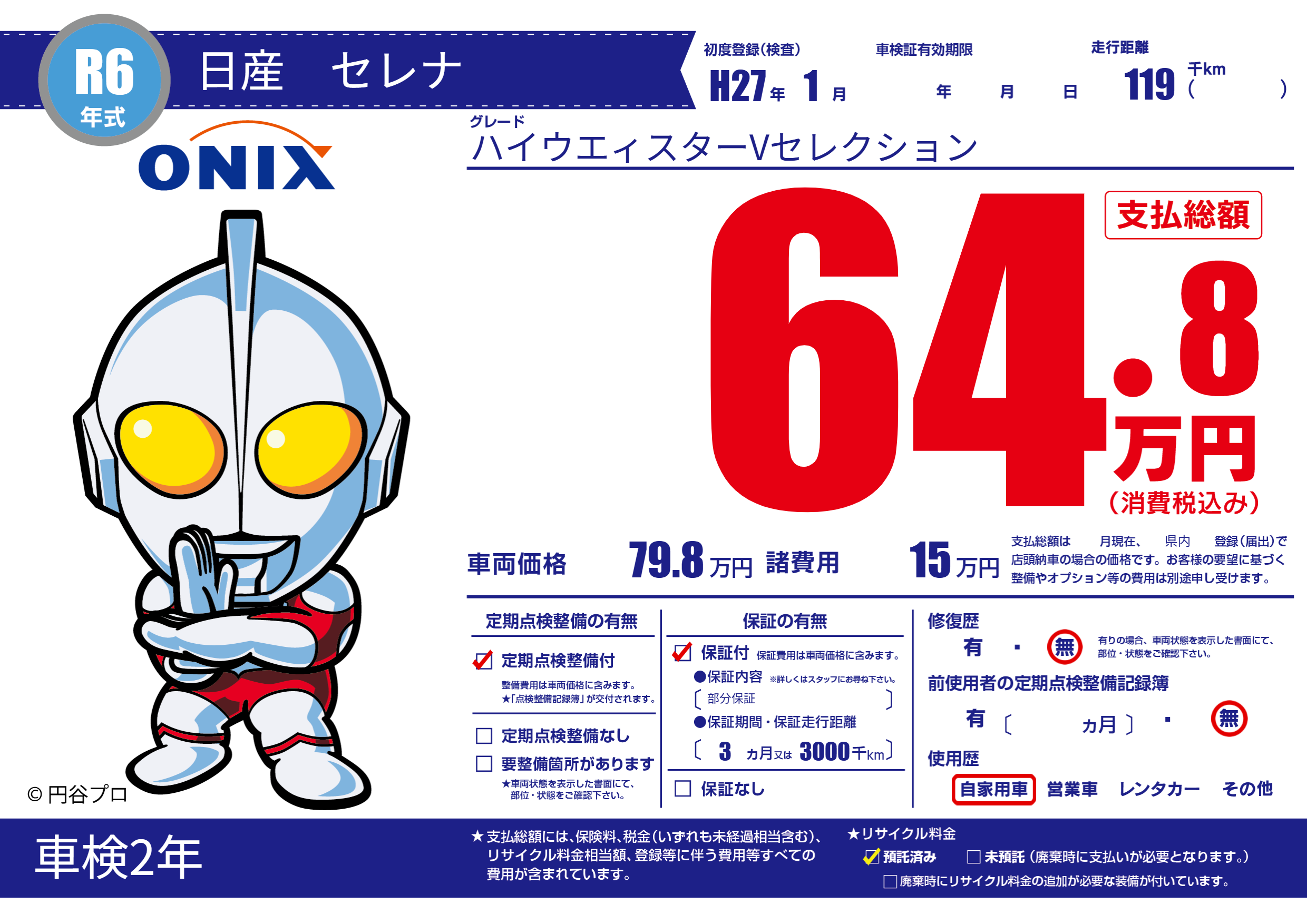 | 車名 | 日産 セレナ | グレード ミッション 排気量 |