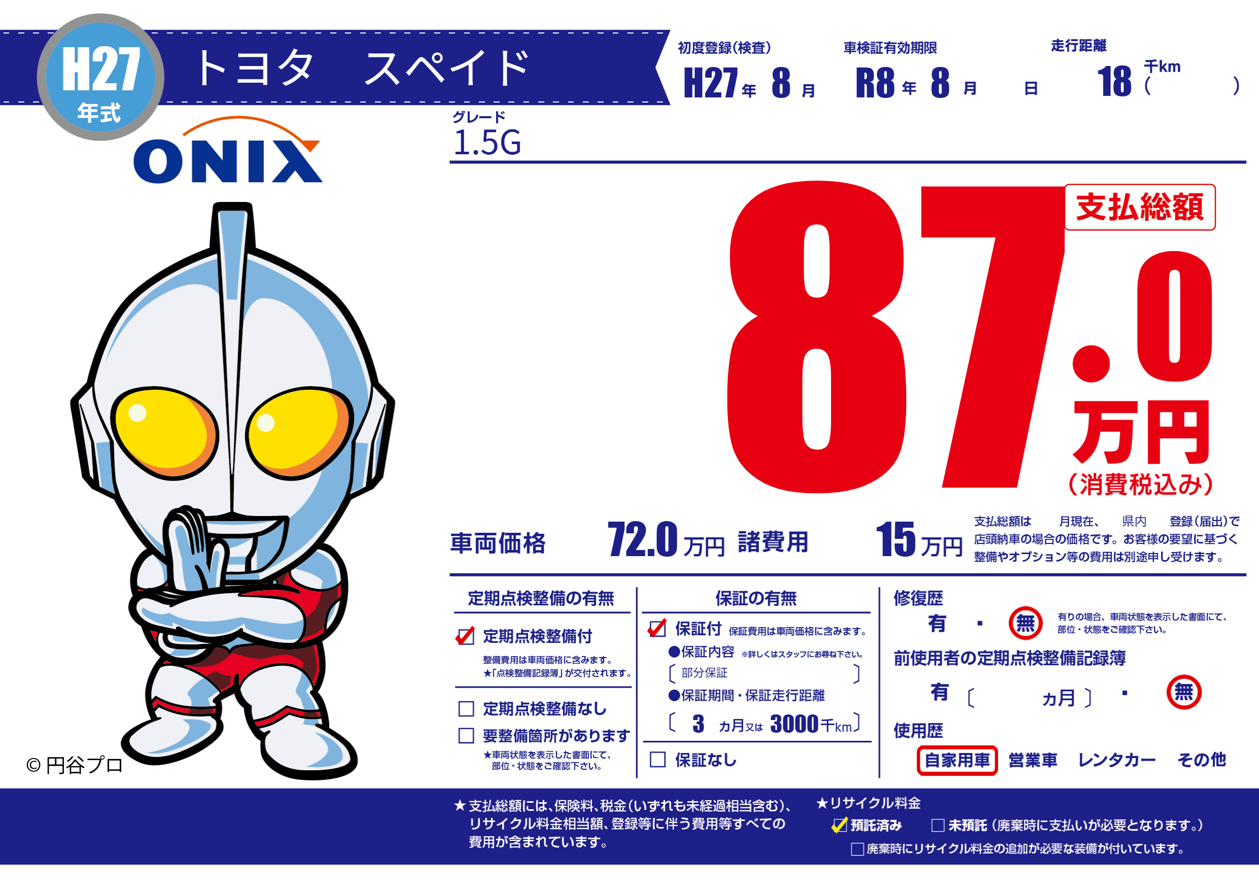 | 車名 | トヨタ スペイド | グレード ミッション 排気量 |