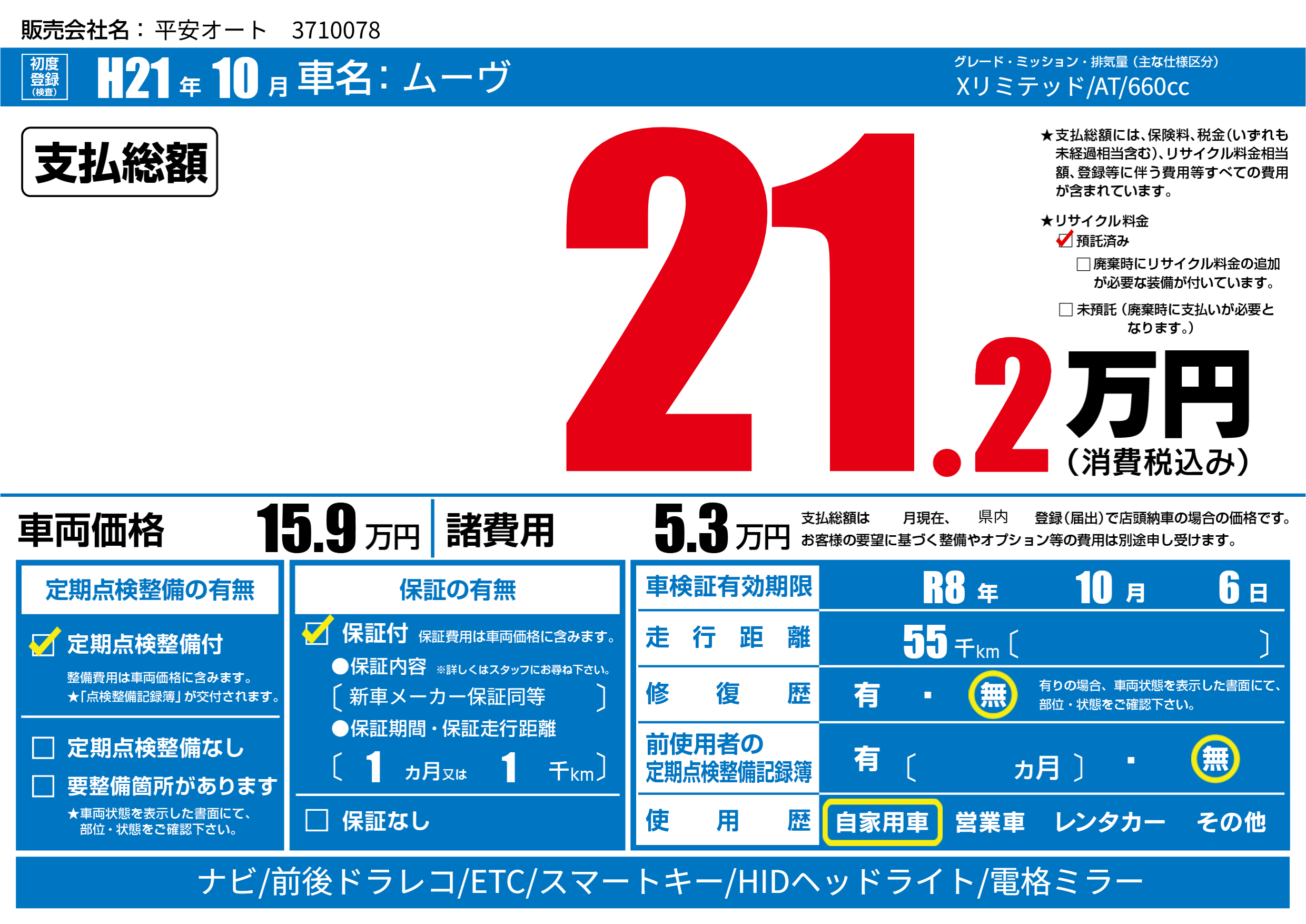 | 車名 | ムーヴ | グレード ミッション 排気量 |