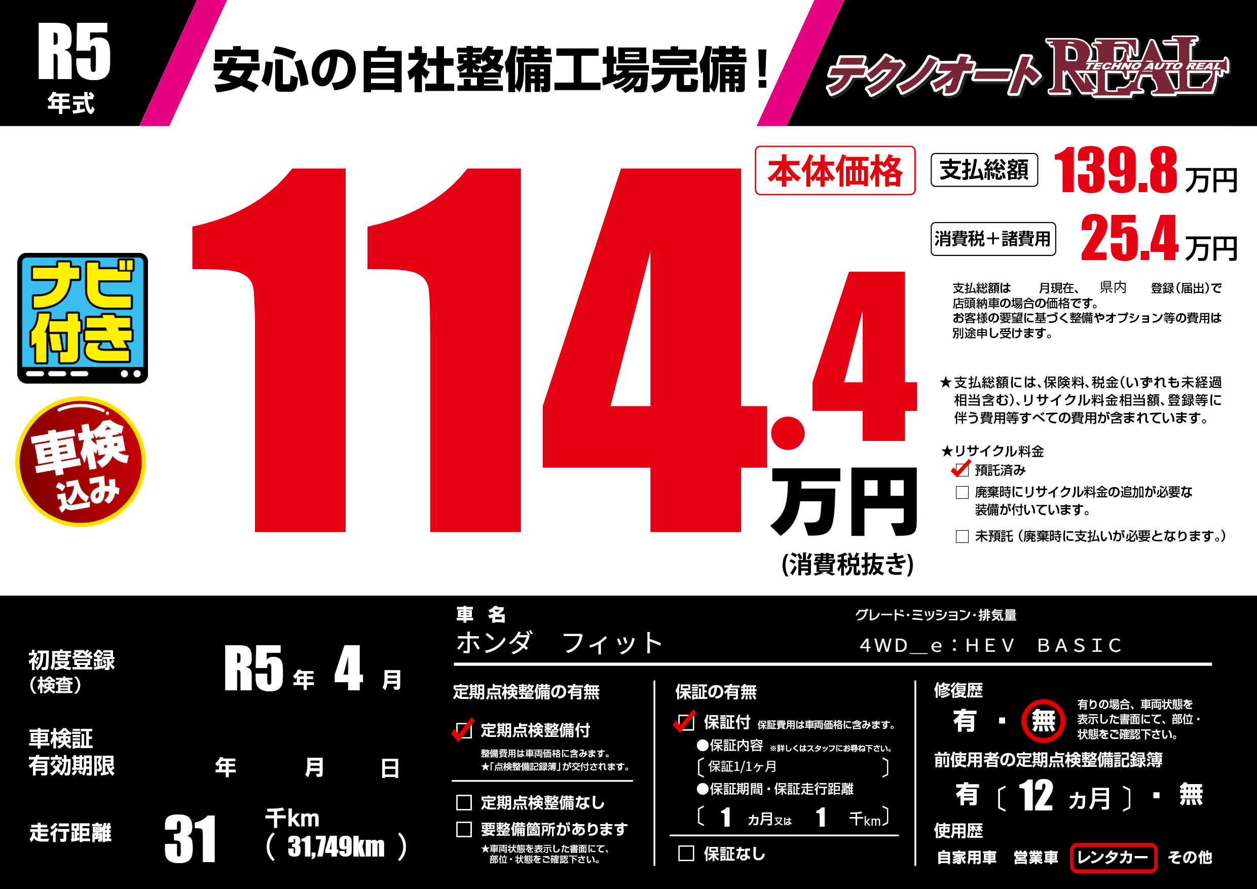 | 走行キロ | 3.1万km | 初年度登録 | R5年4月 |