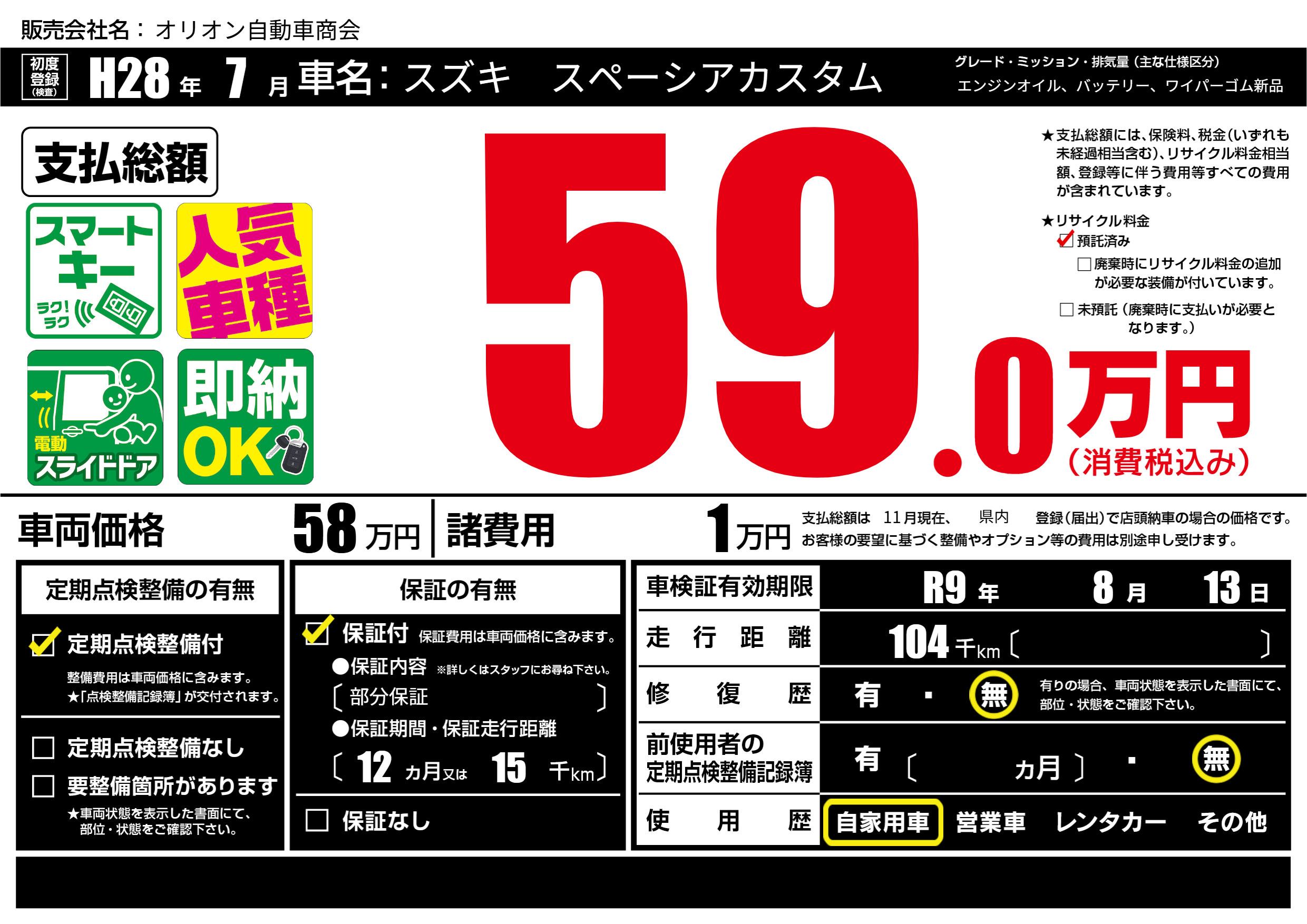 | 車名 | スズキ スペーシアカスタム | グレード ミッション 排気量 |