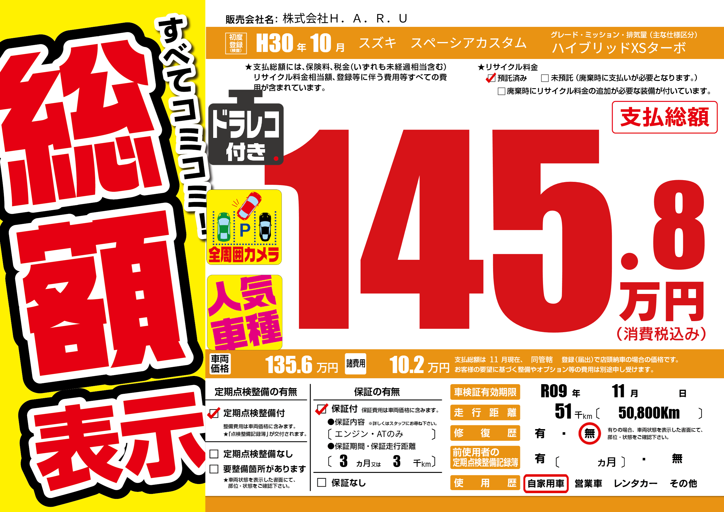 | 車名 | スズキ スペーシアカスタム | グレード ミッション 排気量 |