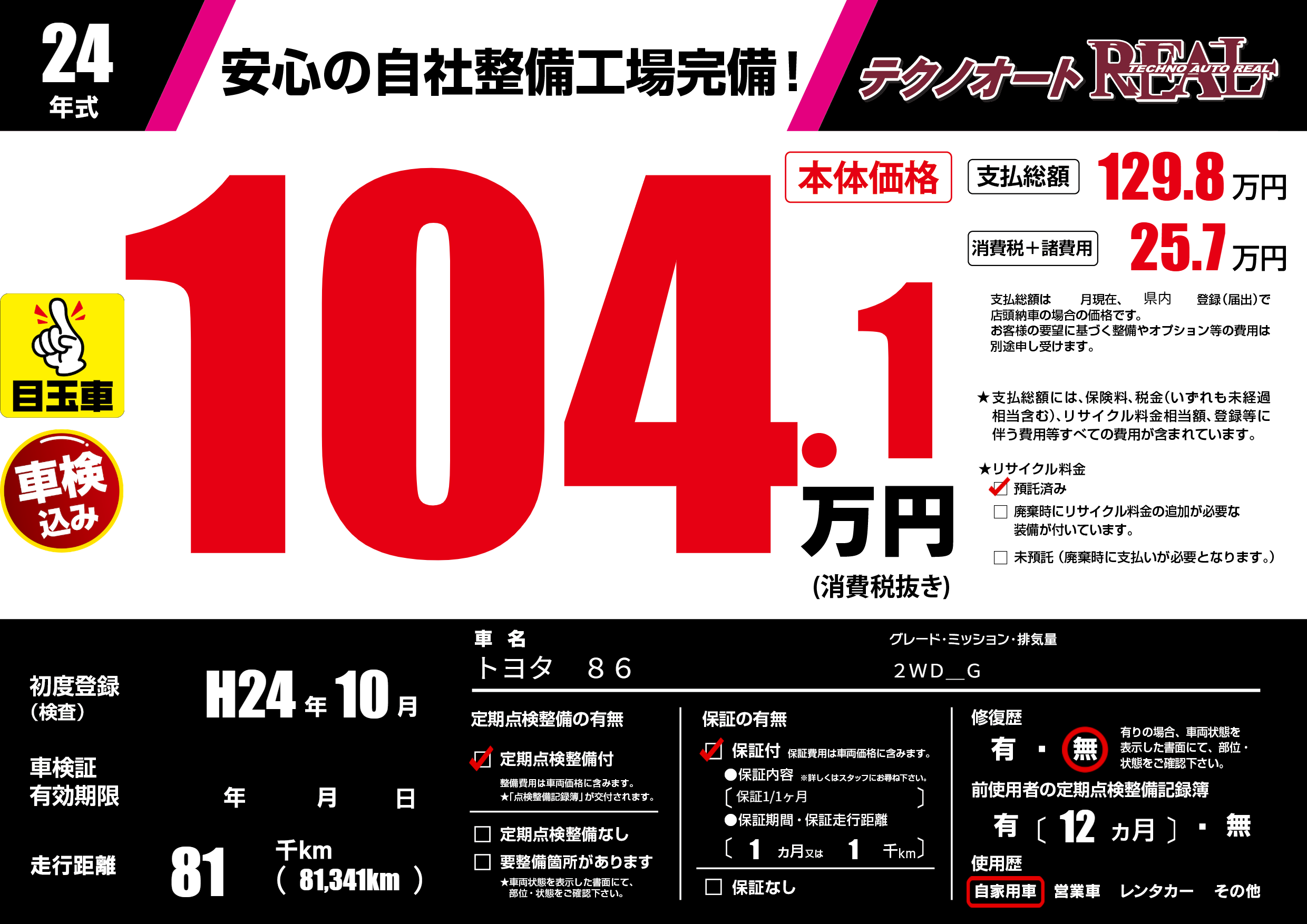 | 車名 | トヨタ 86 | グレード ミッション 排気量 |