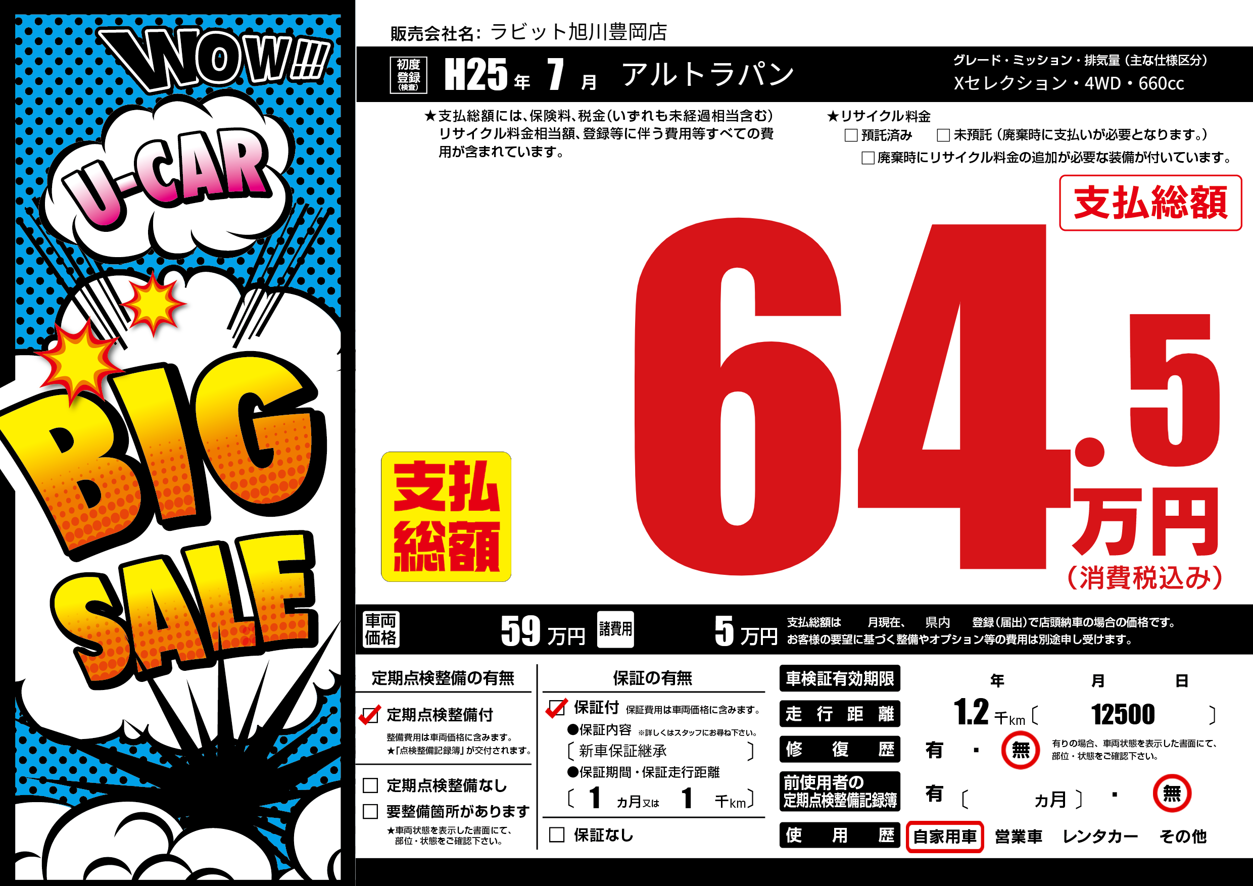 | 走行キロ | 0.1万km | 初年度登録 | H25年7月 |