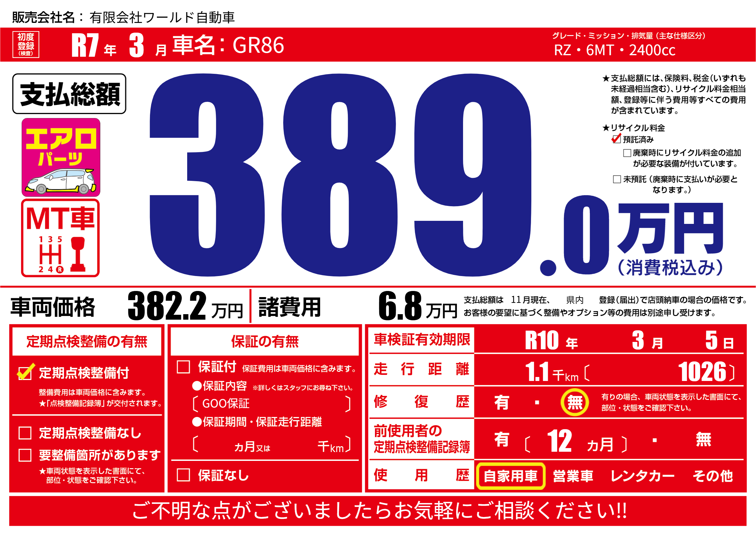 | 車名 | GR86 | グレード ミッション 排気量 |