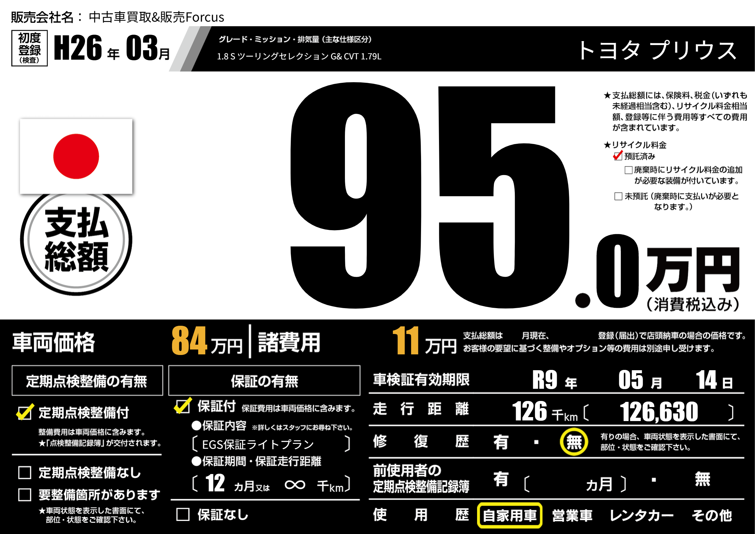 | 車名 | トヨタ プリウス | グレード ミッション 排気量 |