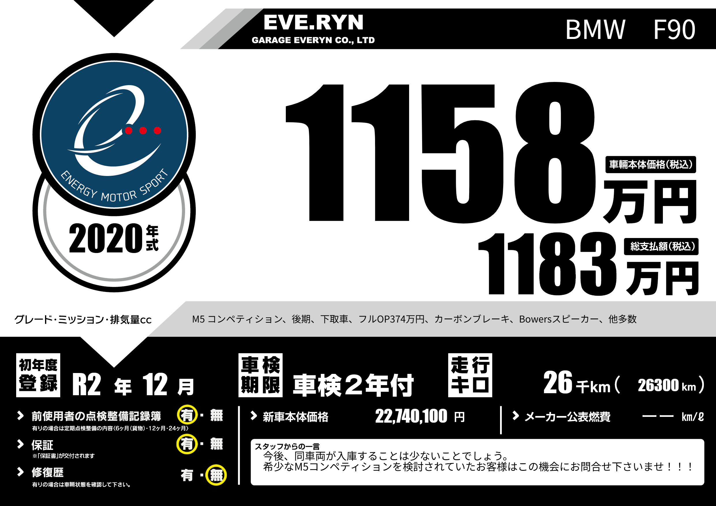 M5 コンペティション、後期、下取車、フルOP374万円、カーボンブレーキ、Bowersスピーカー、他多数 |