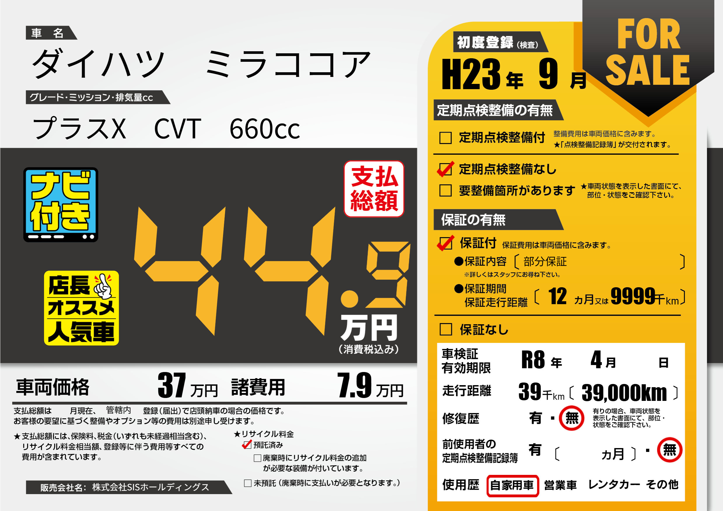 なし | 車検制限 | R8年4月---月 |