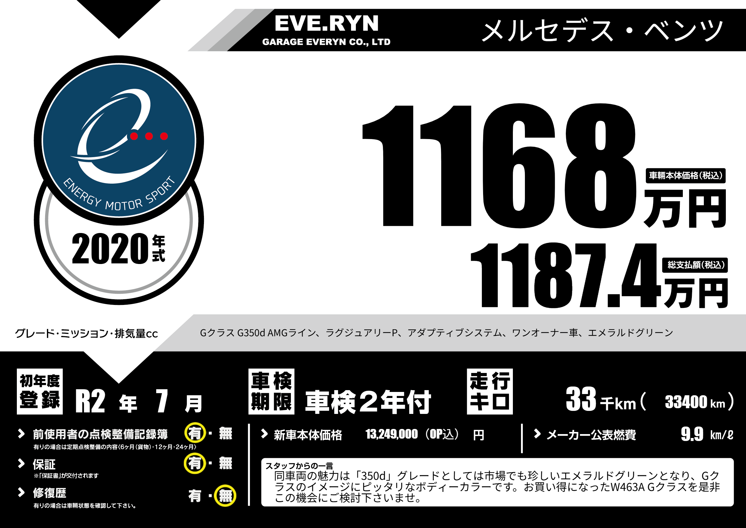 Gクラス G350d AMGライン、ラグジュアリーP、アダプティブシステム、ワンオーナー車、エメラルドグリーン |