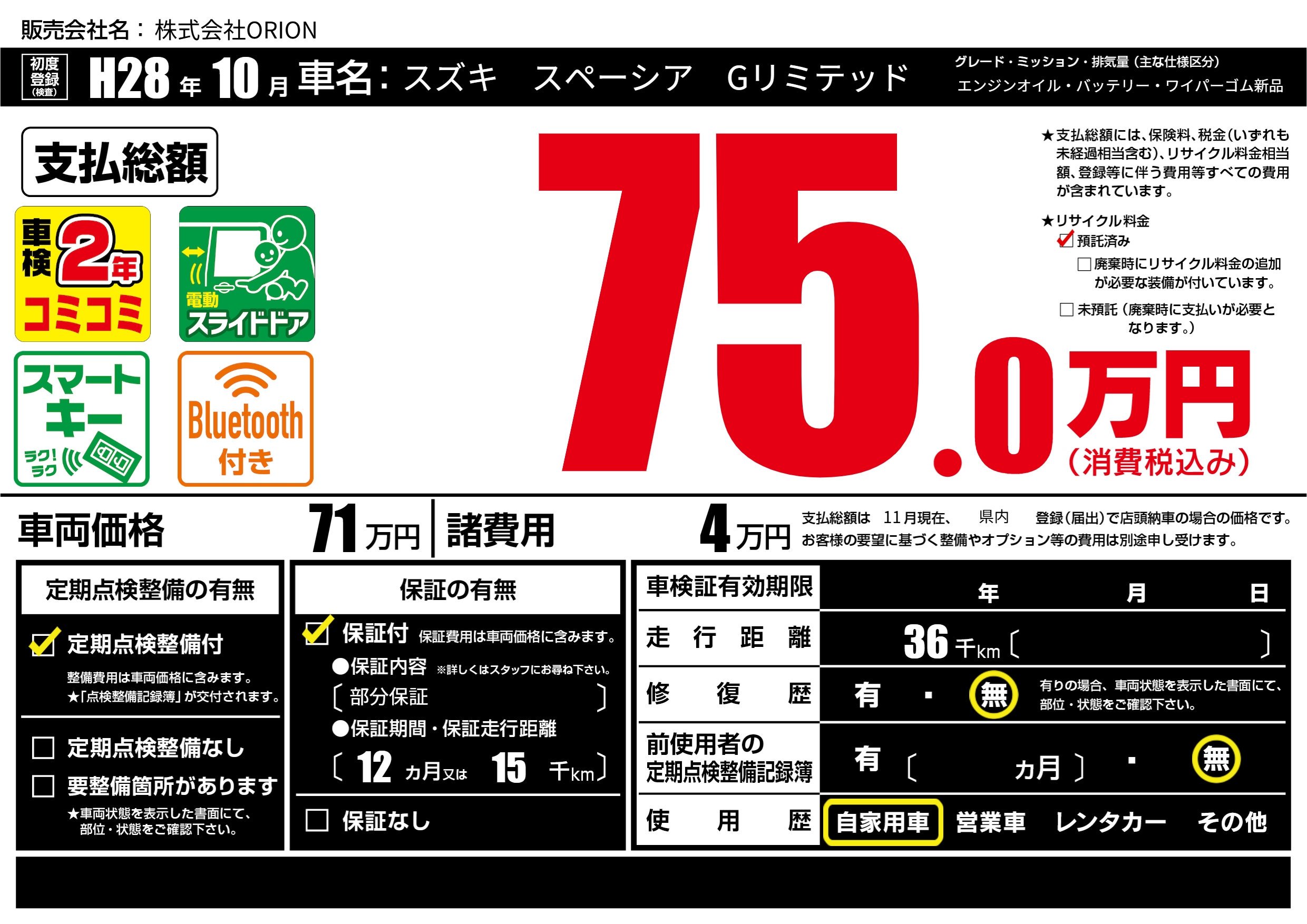 | 車名 | スズキ スペーシア Gリミテッド | グレード ミッション 排気量 |
