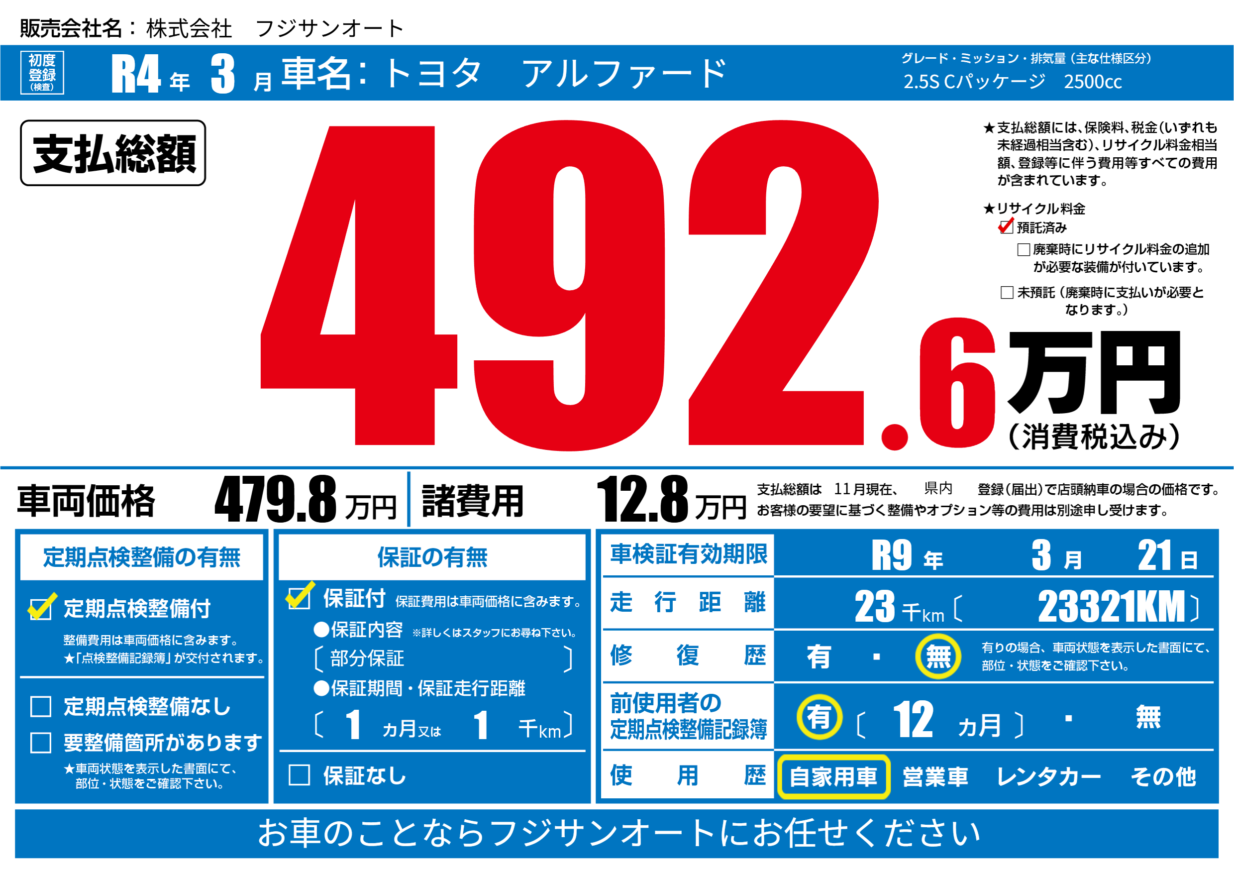 | 車名 | トヨタ アルファード | グレード ミッション 排気量 |