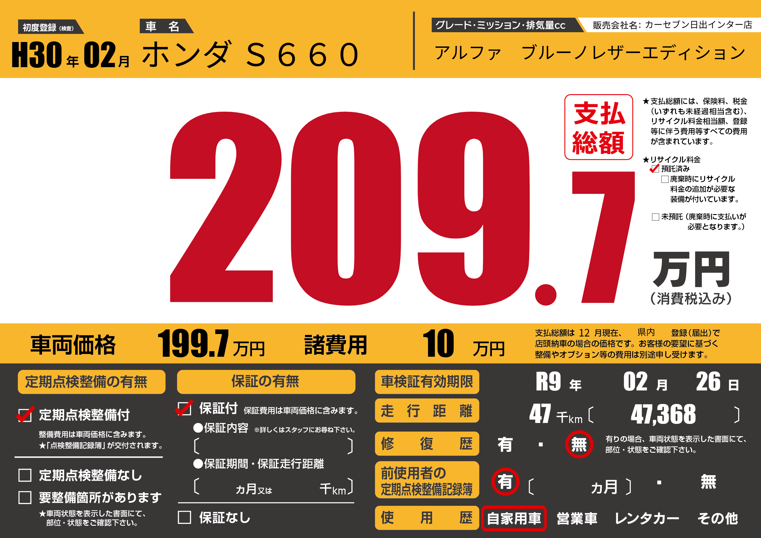 | 車名 | ホンダ S660 | グレード ミッション 排気量 |