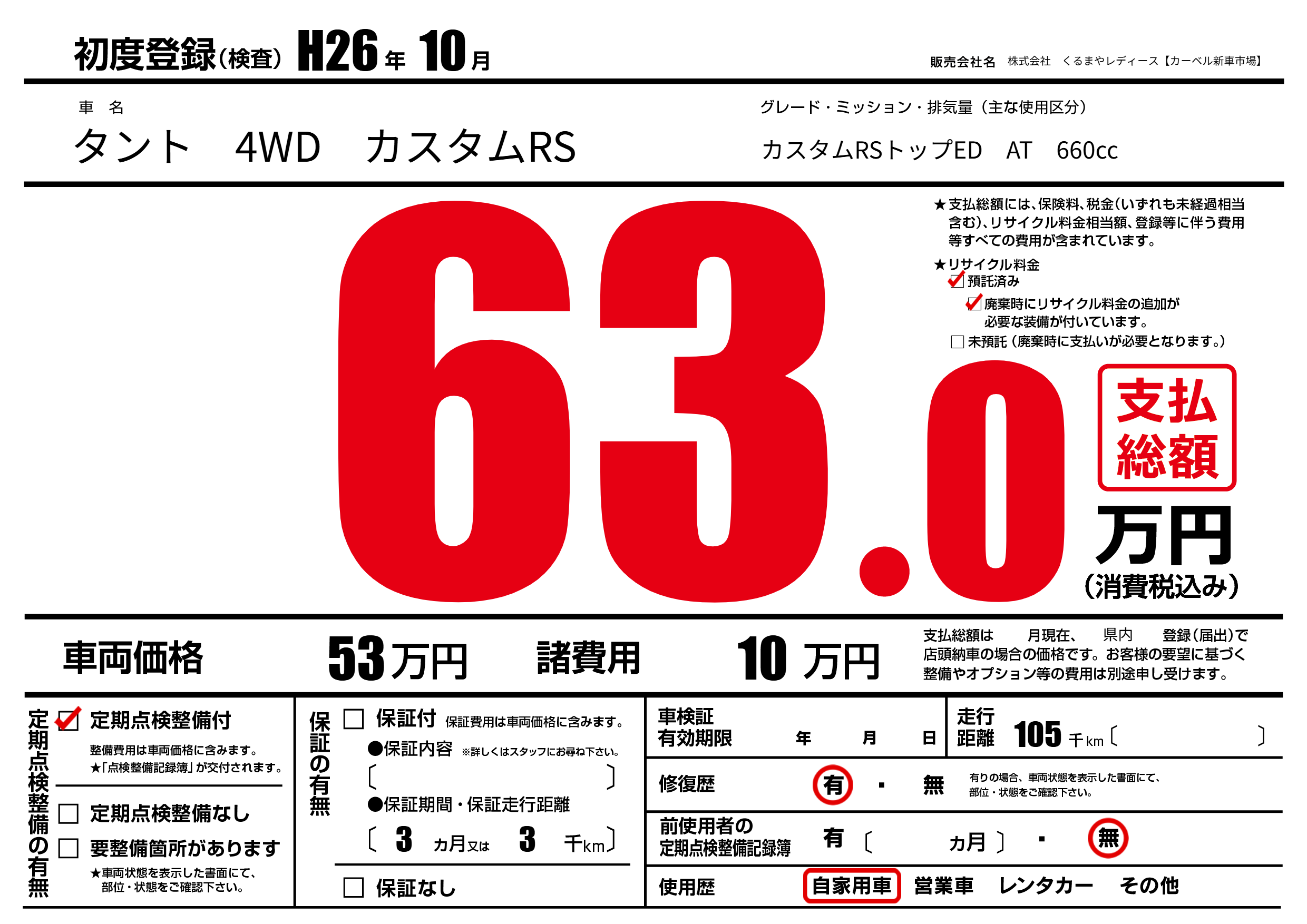 | 走行キロ | 10.5万km | 初年度登録 | H26年10月 |
