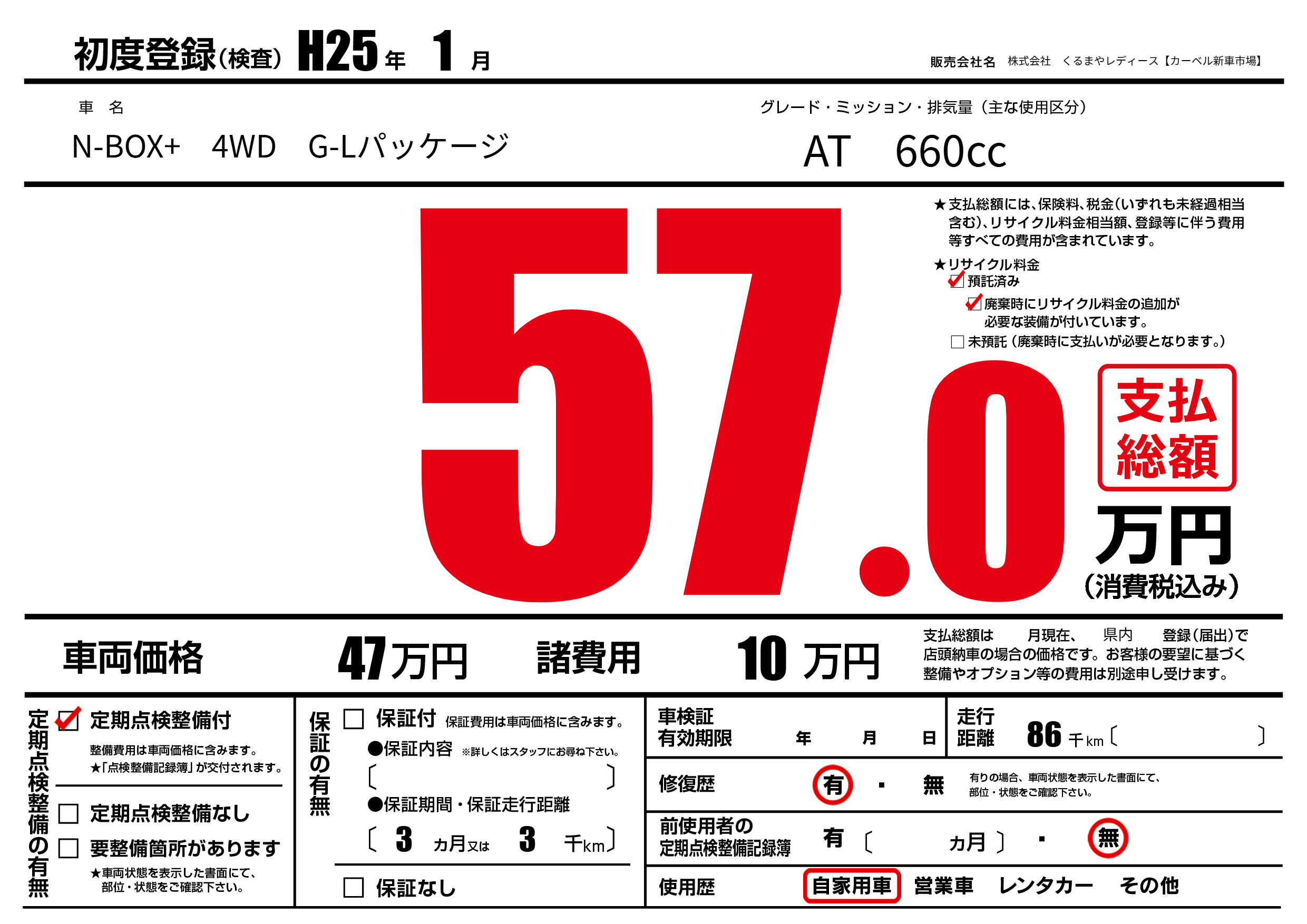 | 車名 | N-BOX+ 4WD G-Lパッケージ | グレード ミッション 排気量 |
