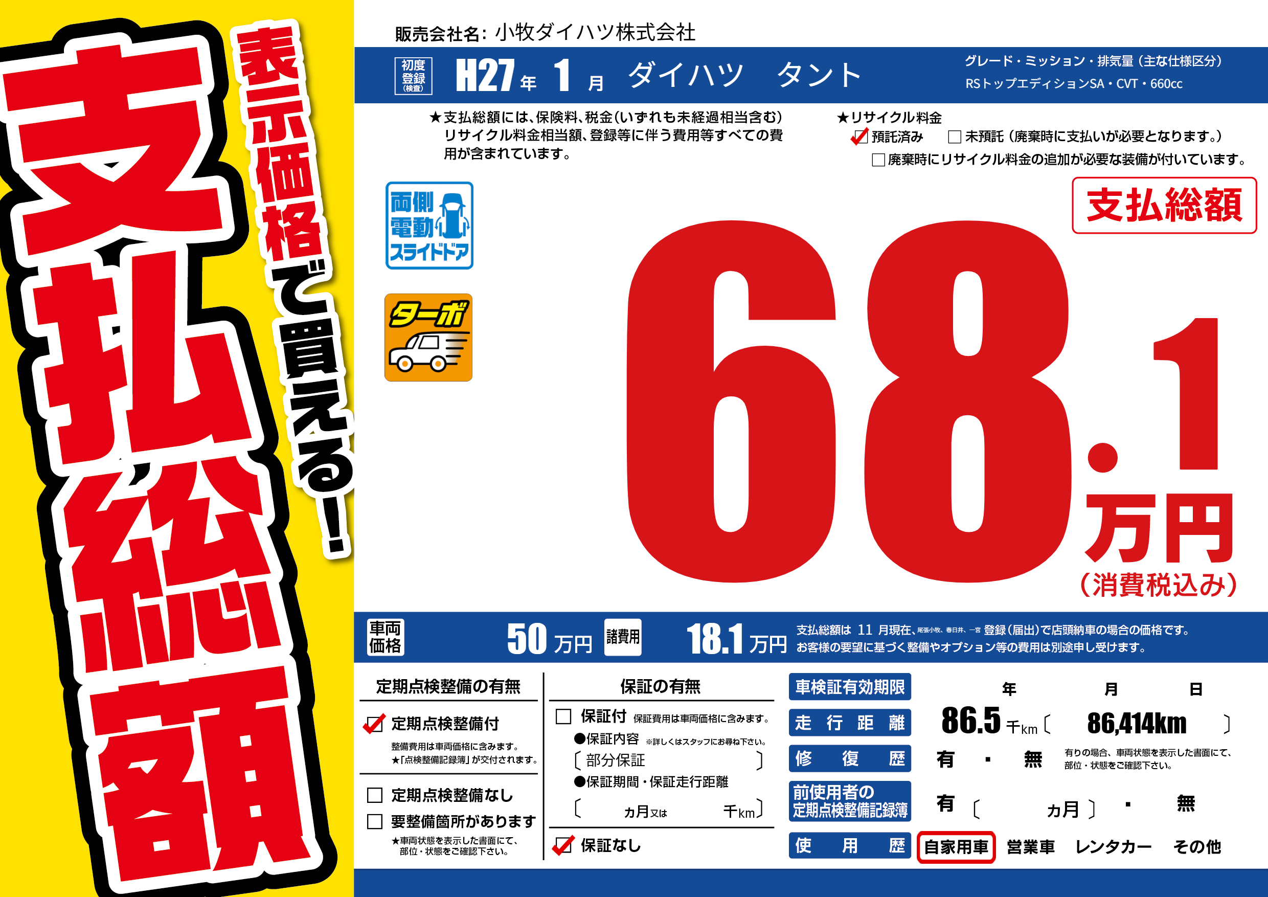 | 車名 | ダイハツ タント | グレード ミッション 排気量 |