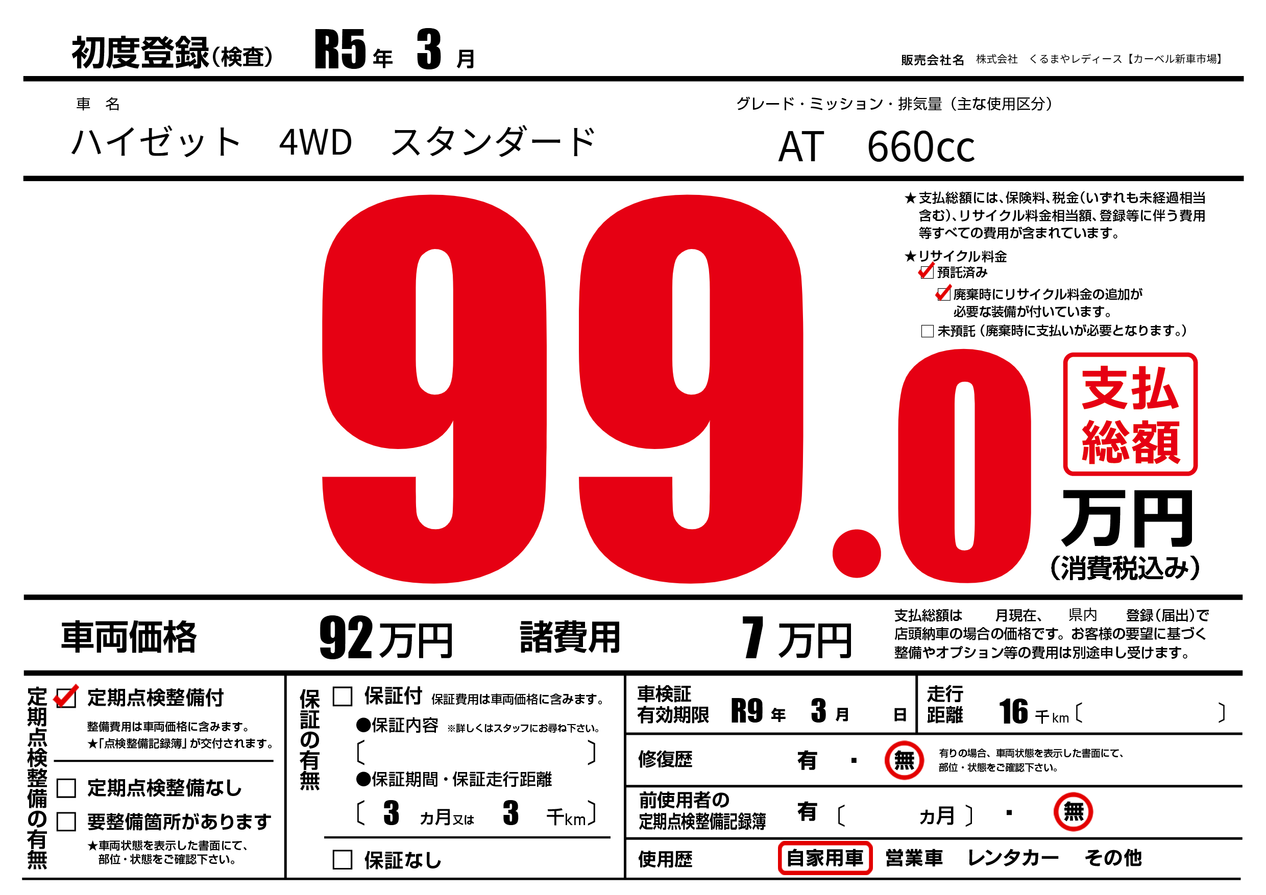 なし | 車検制限 | R9年3月---月 |