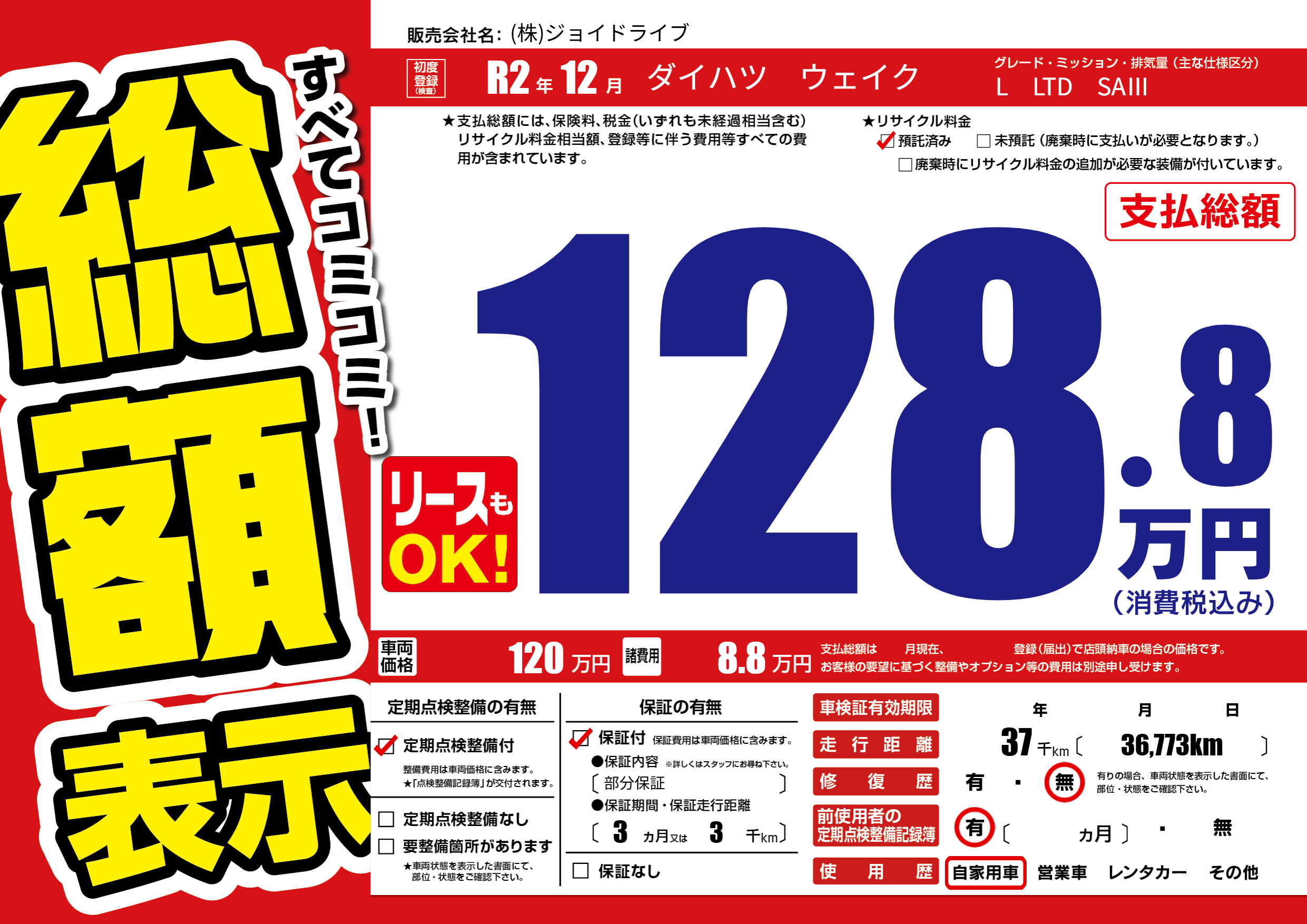 | 走行キロ | 3.7万km | 初年度登録 | R2年12月 |