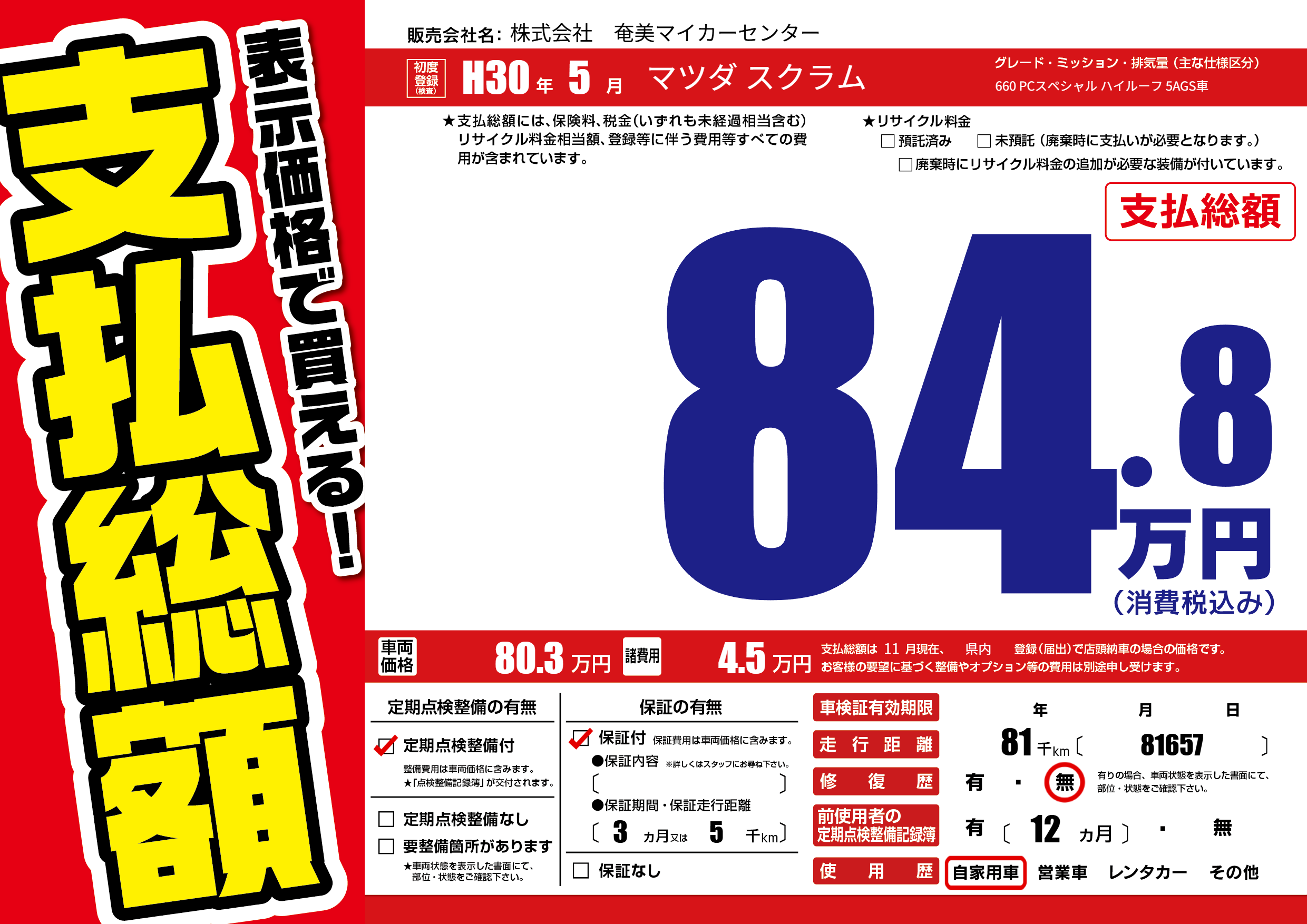 | 走行キロ | 8.1万km | 初年度登録 | H30年5月 |