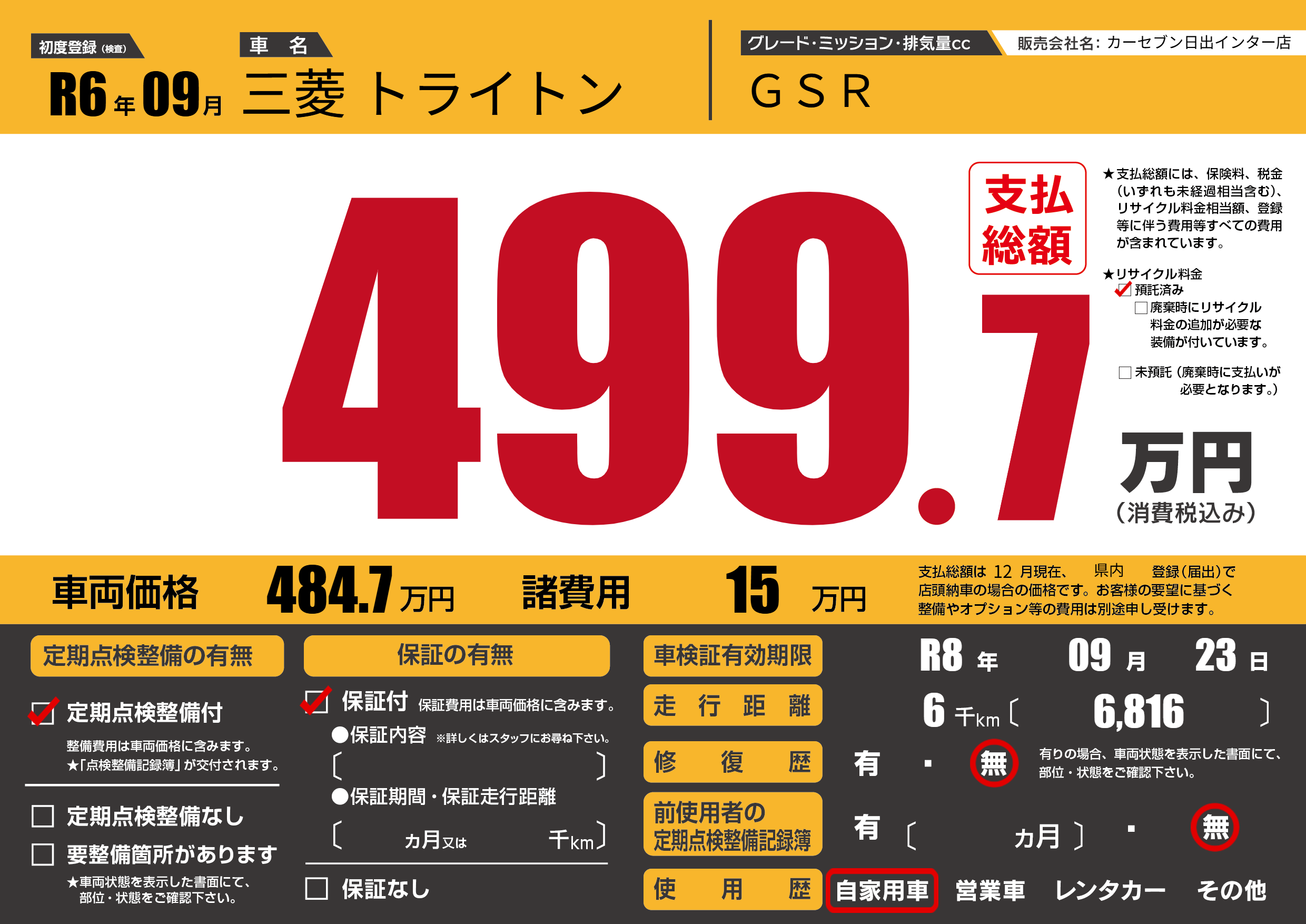 | 走行キロ | 0.6万km | 初年度登録 | R6年09月 |