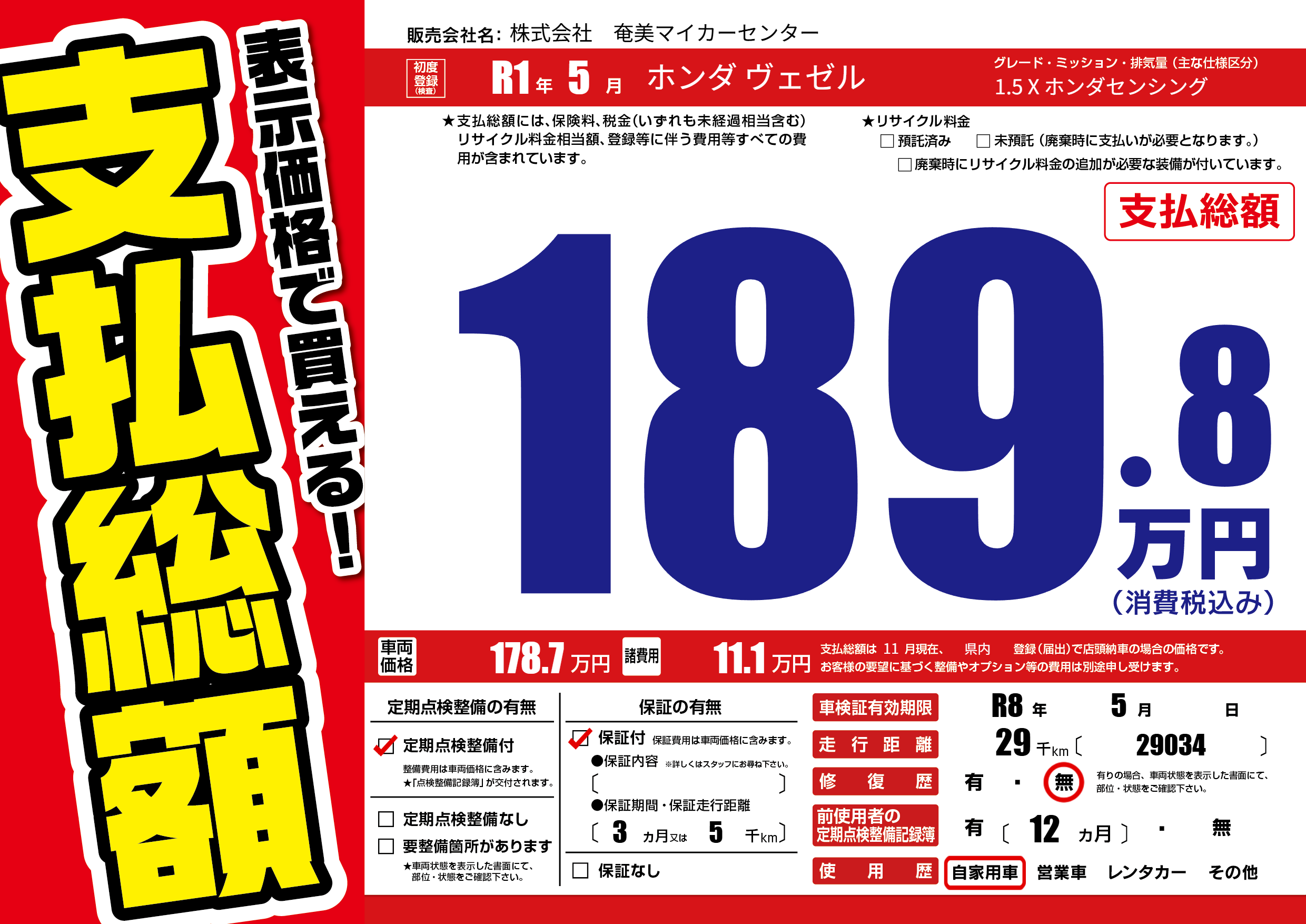| 走行キロ | 2.9万km | 初年度登録 | R1年5月 |