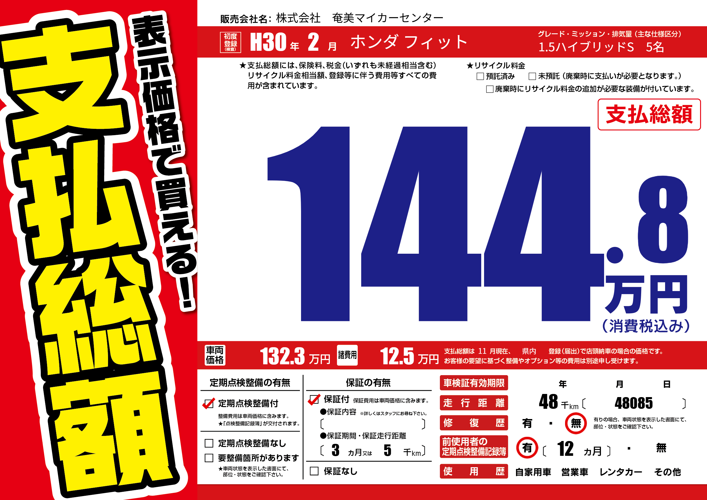 | 走行キロ | 4.8万km | 初年度登録 | H30年2月 |