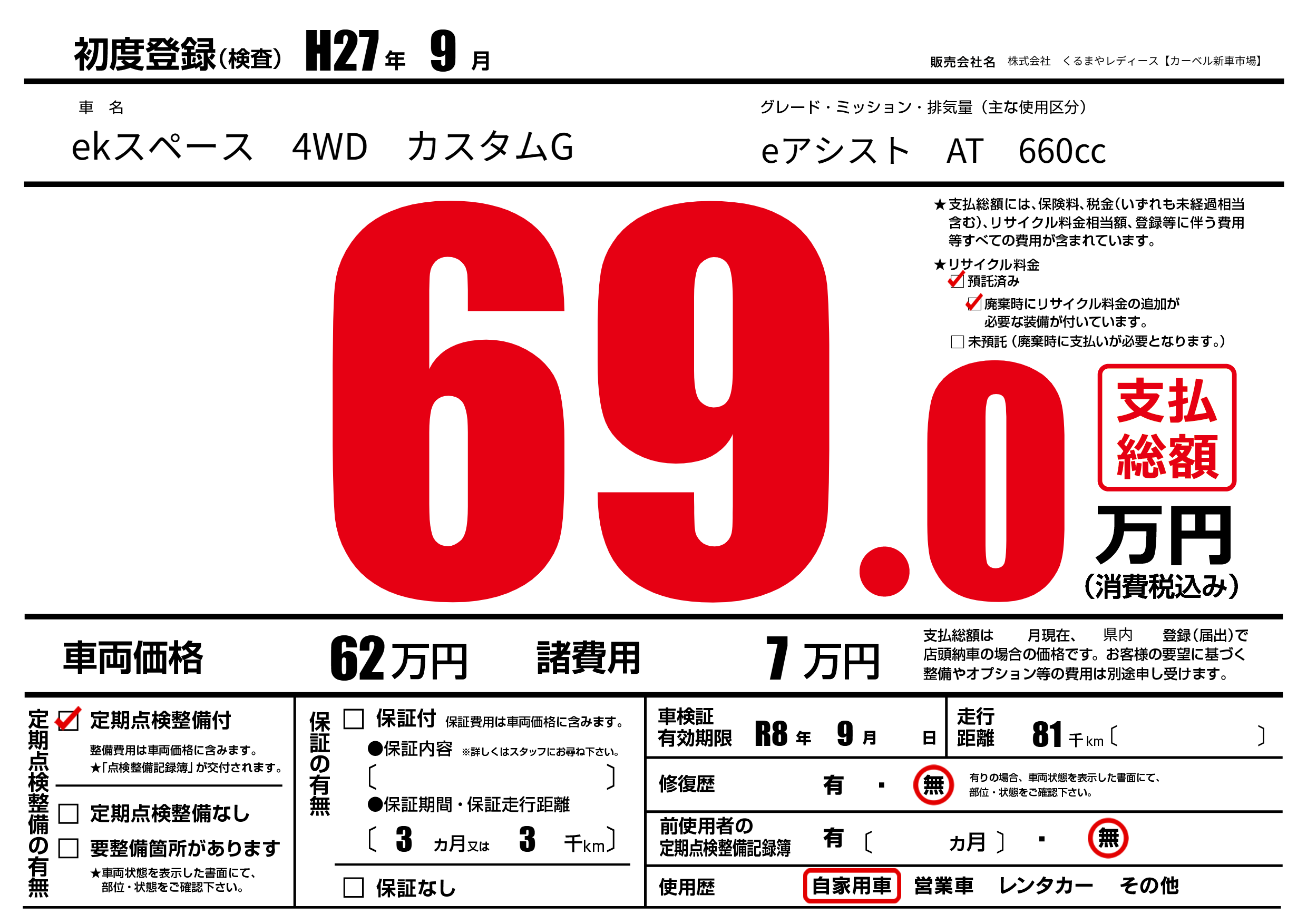 | 走行キロ | 8.1万km | 初年度登録 | H27年9月 |