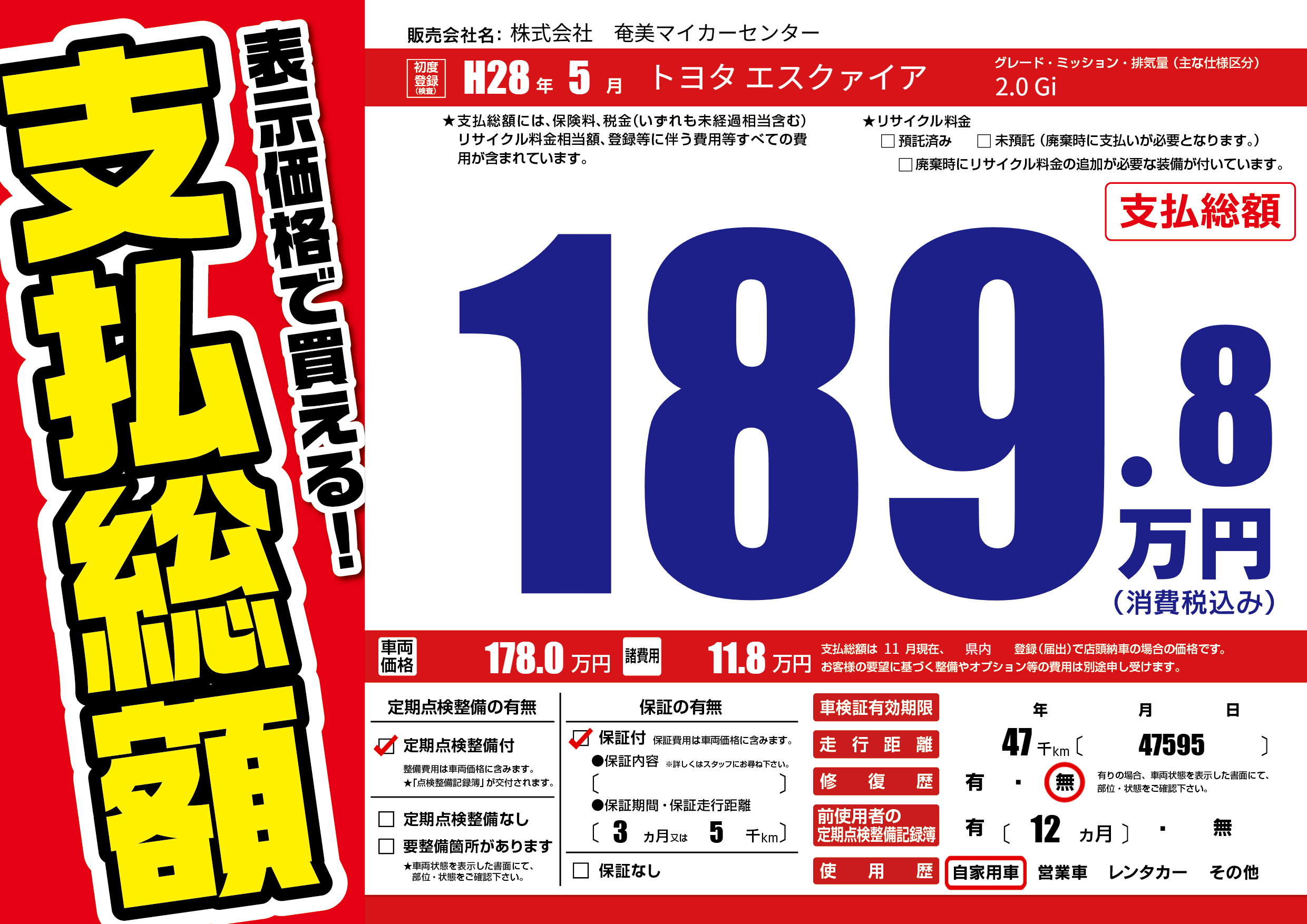 | 走行キロ | 4.7万km | 初年度登録 | H28年5月 |