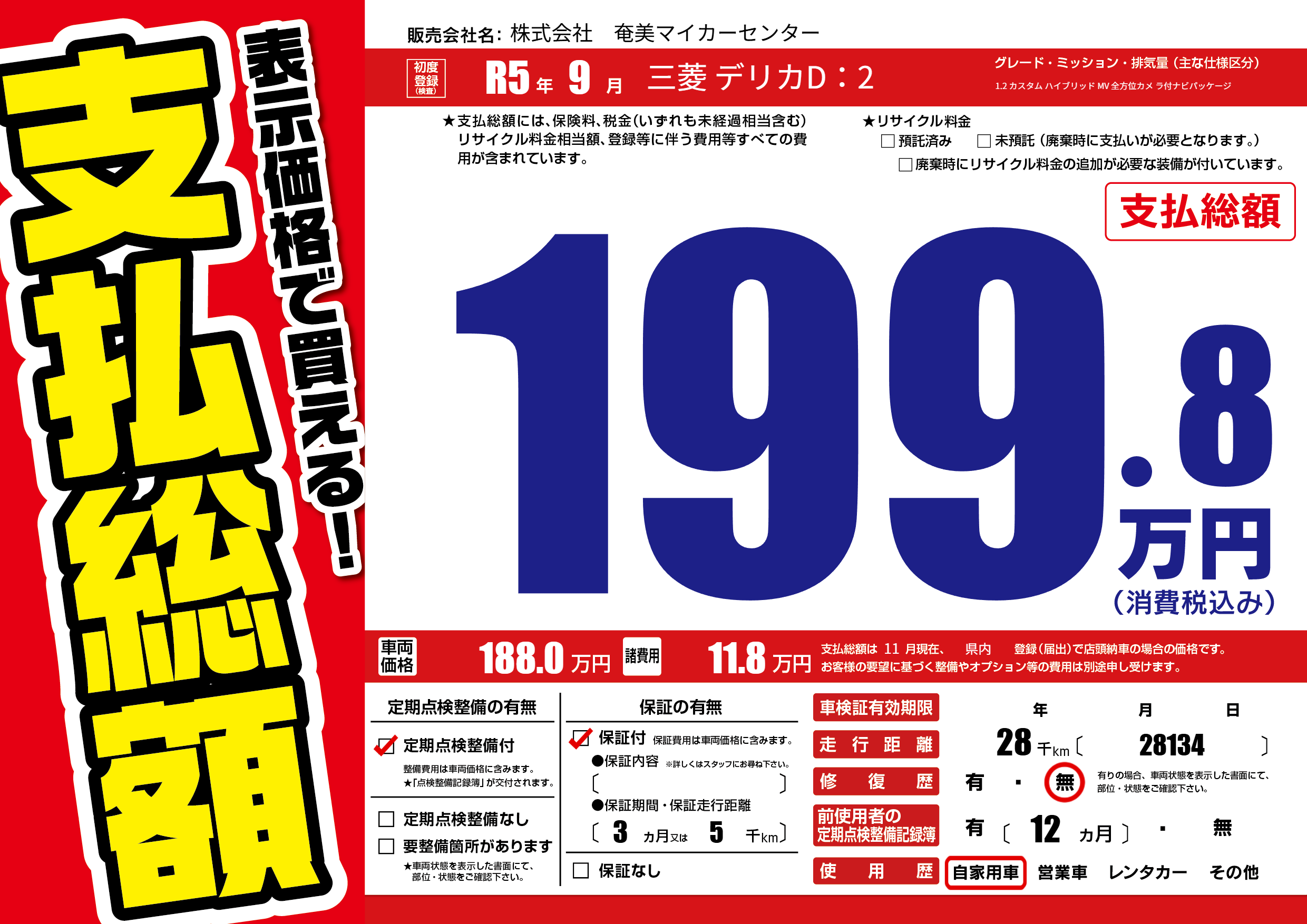 | 走行キロ | 2.8万km | 初年度登録 | R5年9月 |