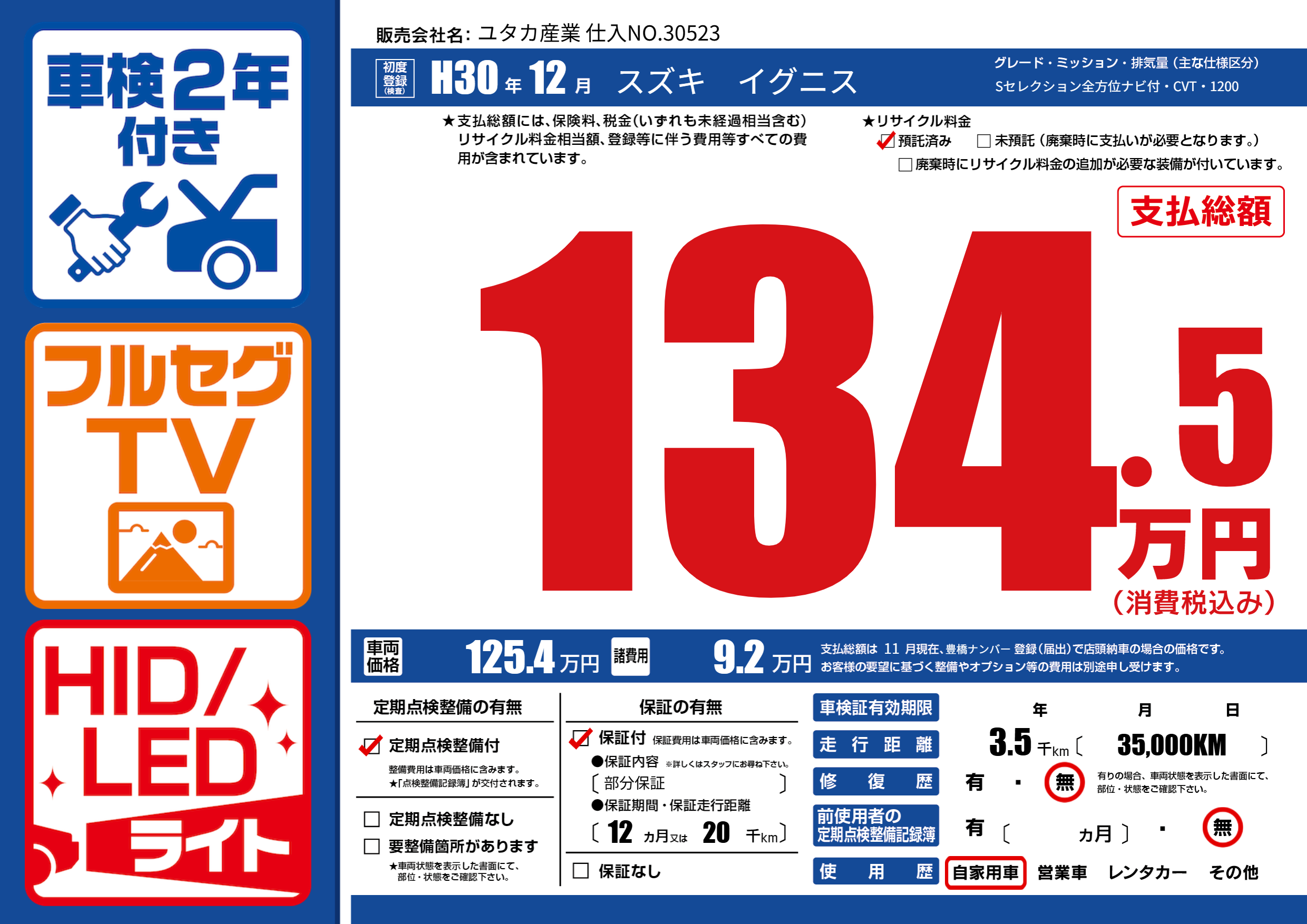 | 走行キロ | 0.3万km | 初年度登録 | H30年12月 |