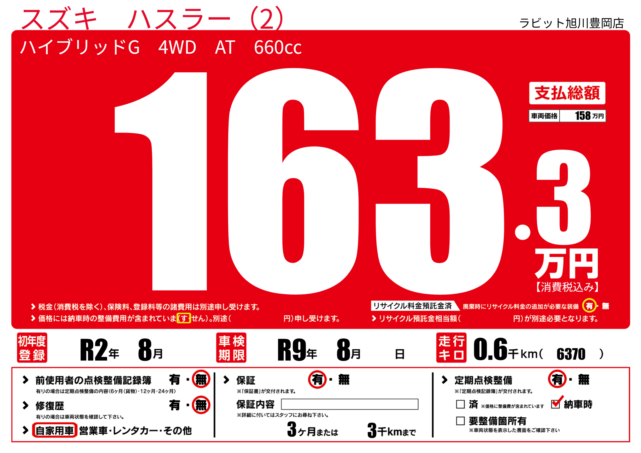 | 車名 | スズキ ハスラー(2) | グレード ミッション 排気量 |